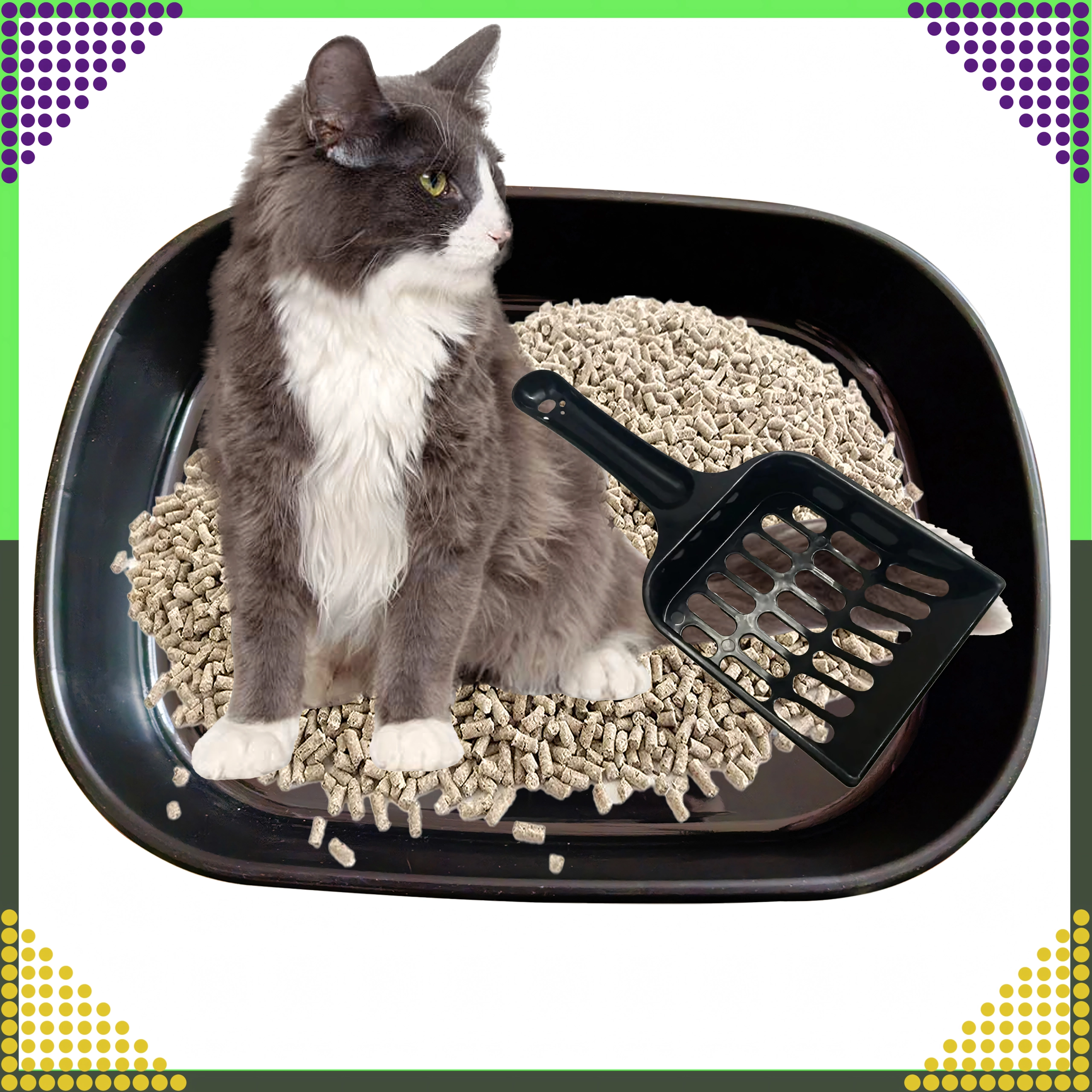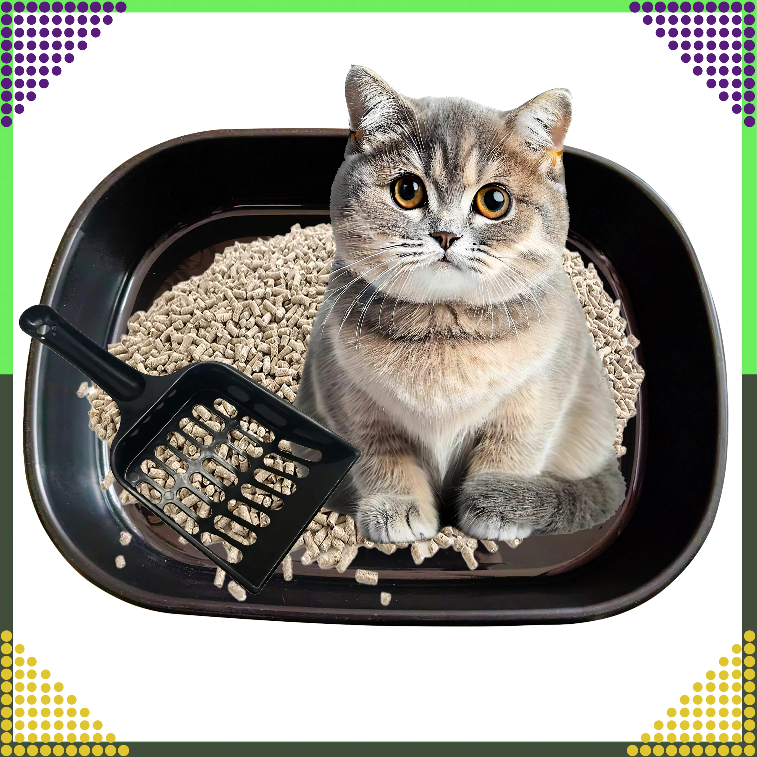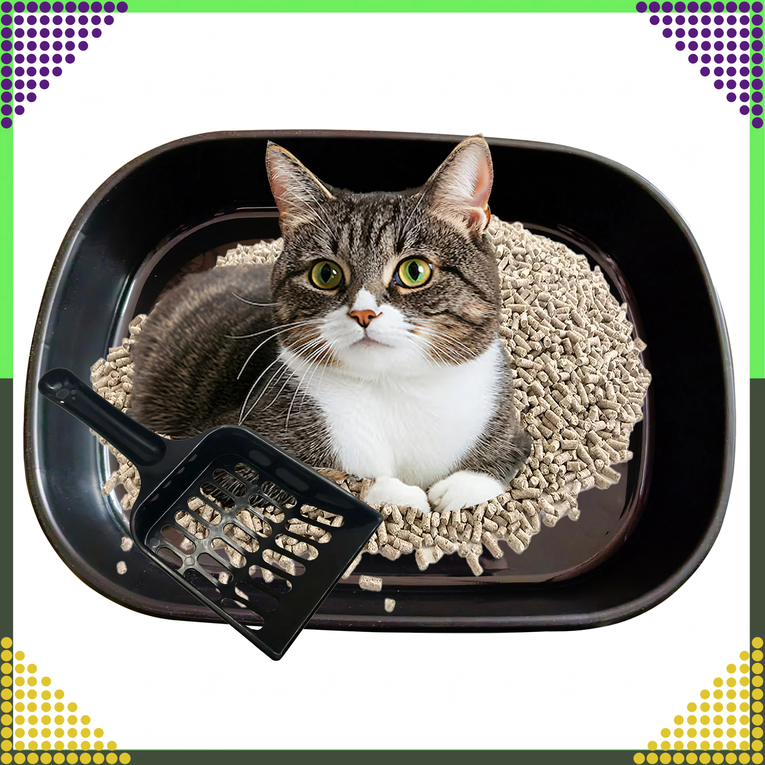 Toilettet er lavet af kvalitets, ikke‑giftig plast, som er holdbar, hygiejnisk og let at vaske af. Den separerede bund og den medfølgende skovl med huller muliggør hurtig sigtning og fjernelse af klumper, så vedligeholdelsen er enkel og ren.