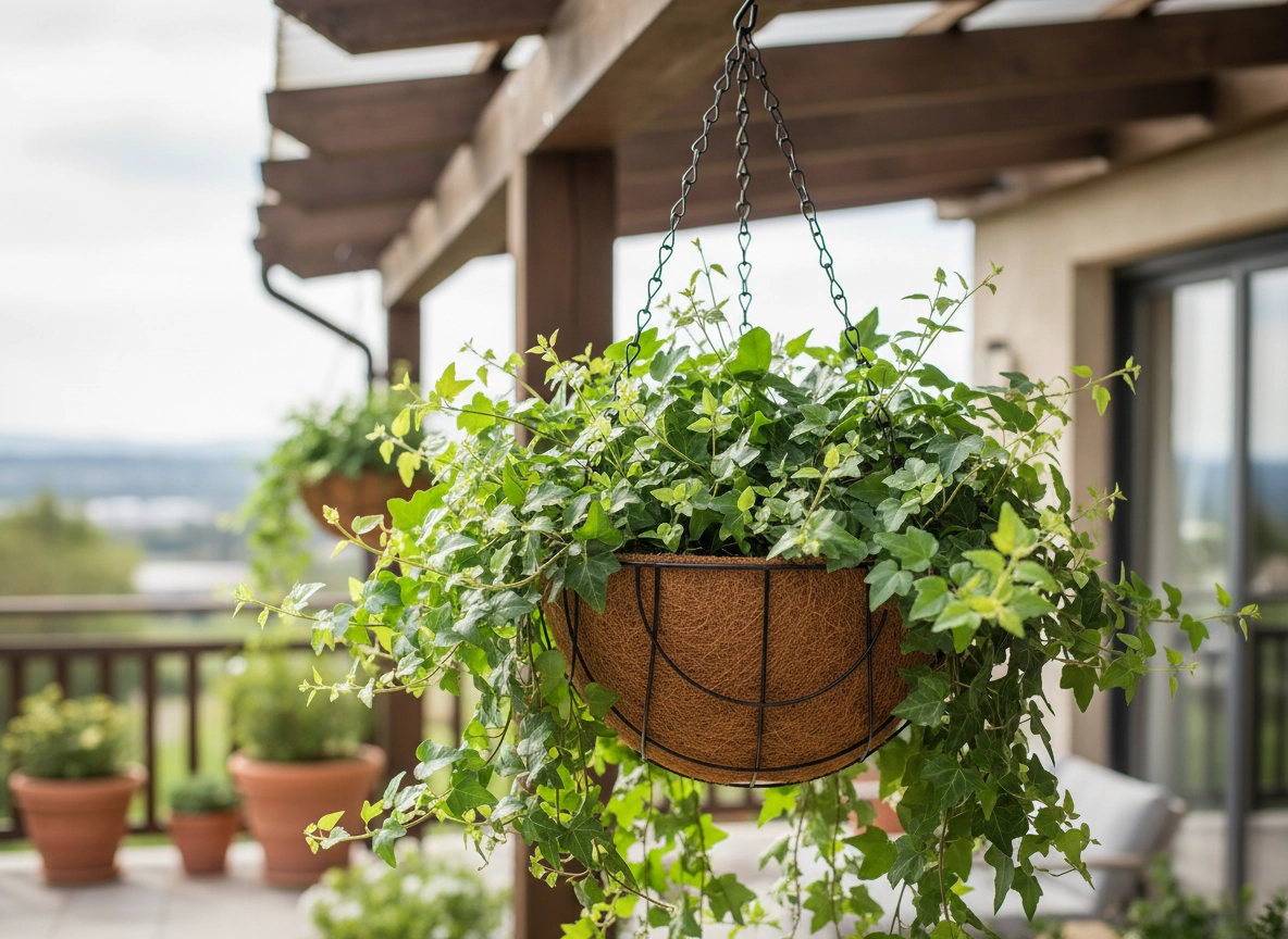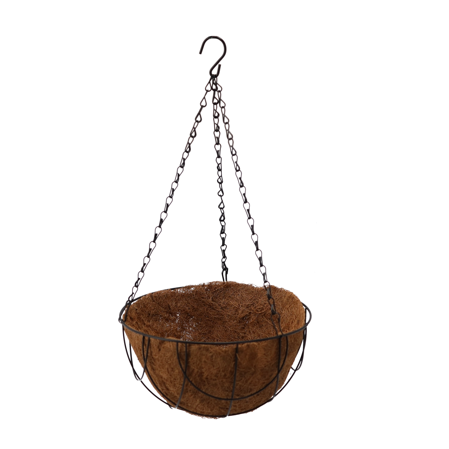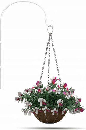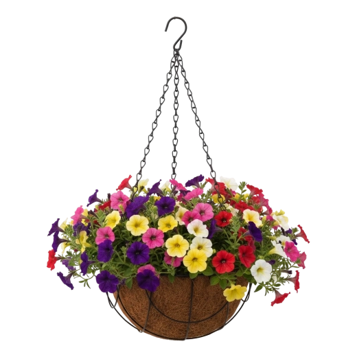 Stilfuld hængende blomsterkurv med naturligt kokosindlæg og robust metalkonstruktion, ideel til altaner, terrasser og indendørs brug. Det åndbare kokosindlæg fremmer sund vækst og naturlig dræning, så hængende planter som petuniaer og bregner kommer smukt til deres ret. Nem ophængning sparer plads og skaber et dekorativt grønt fokuspunkt hvor som helst.