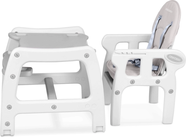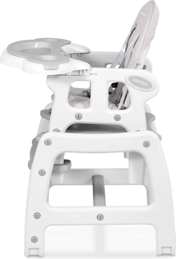 Stolen tilbyder 5 praktiske konfigurationer: høj stol med bakke, høj stol uden bakke, lav stol, separat stol med bord og en variant til større børn. Den tredelte ryglænsjustering øger komforten, mens den dobbelte aftagelige bakke med forhøjede kanter og åbninger til kopper forebygger spild af drikkevarer.