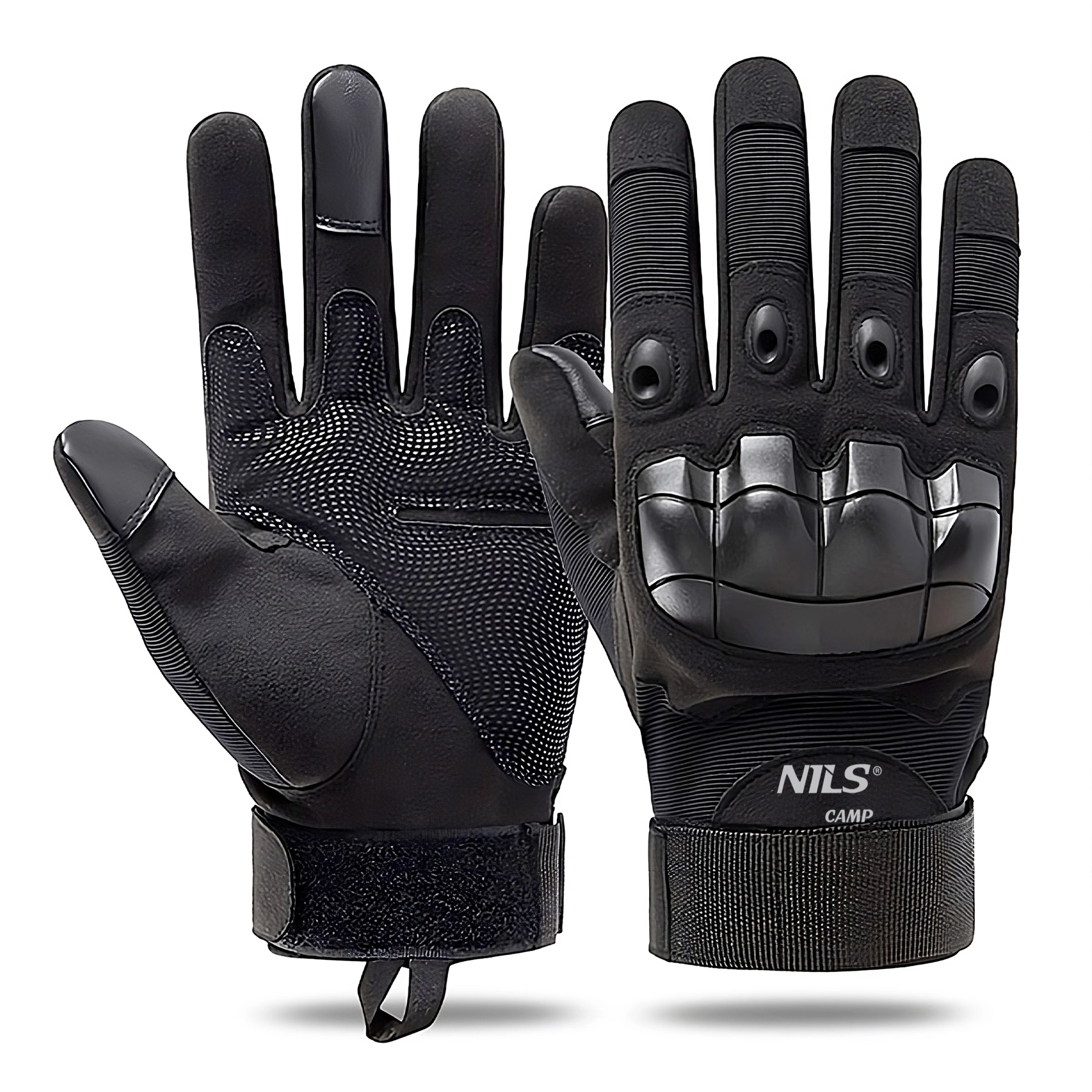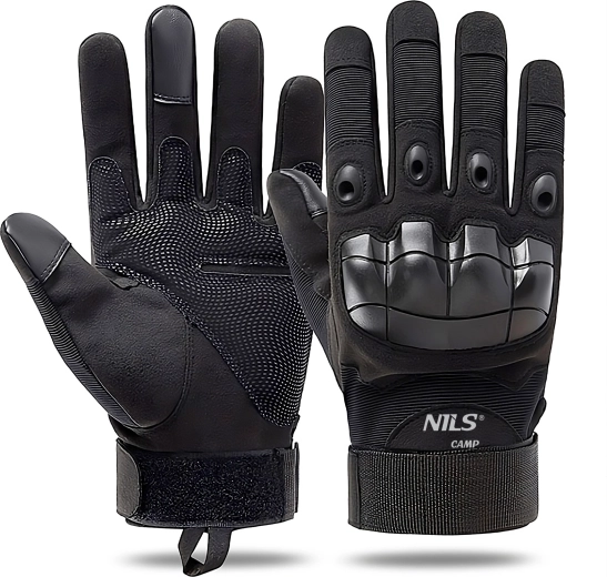 Holdbare taktiske handsker NILS Camp i sort kombinerer beskyttelse, sikkert greb og fuld bevægelsesfrihed. Takket være en blanding af polyester, nylon og gummi klarer de krævende forhold, har forstærkede knoer, skridsikker håndflade og er kompatible med touchskærme, så du kan bruge mobilen uden at tage handskerne af.