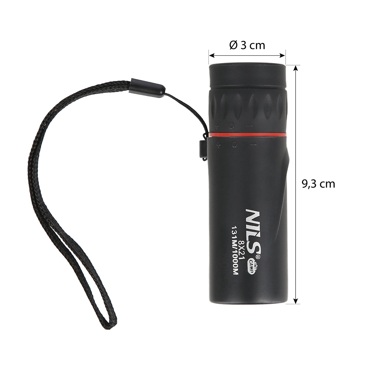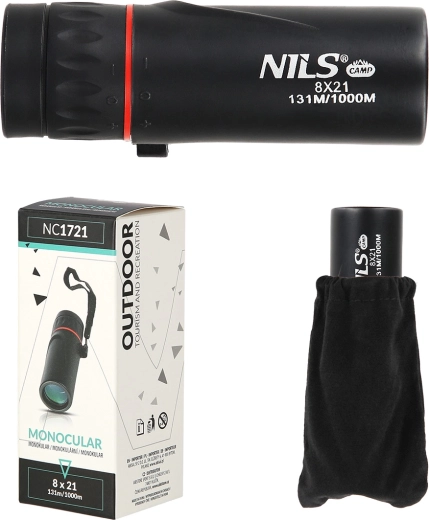 Den kompakte og lette monokular NILS Camp 8x21 er ideel til vandreture, udflugter og natur-observation. Den tilbyder 8× forstørrelse, bredt synsfelt på 131 m/1 km og antirefleks-behandlede linser for et klart, lyst billede uden generende reflekser. Det gummierede hus ligger godt i hånden, og fokuseringsmekanismen muliggør hurtig og præcis fokusering. I pakken medfølger etui og pudseklud.