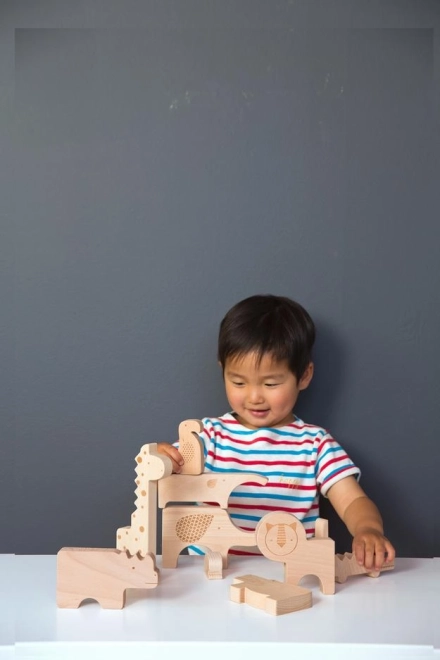 Børn kan lægge brikkerne i rammen eller bygge dyretårne af dem. Støtter finmotorik, koordination og tålmodighed.
