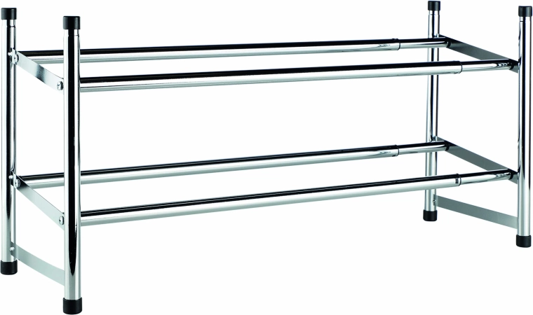 Praktisk skohylde med to niveauer til overskuelig opbevaring af fodtøj i entré eller garderobe. Takket være justerbar bredde og kromet stålkonstruktion tilbyder den holdbarhed, stabilitet og pladsbesparelse.