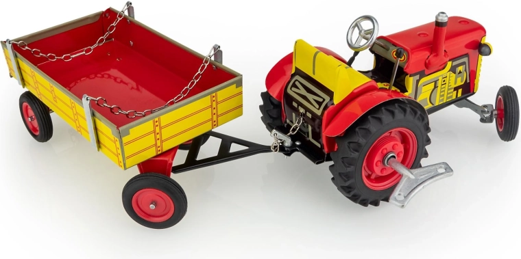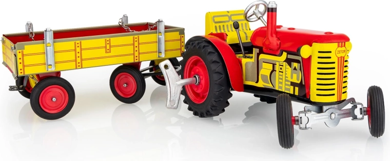 En metalmodel af ZETOR-traktor med tipvogn fra KOVAP, der glæder både små og store teknikfans. Driften sikres af et fjederurværk med nøgle, og modellen har funktionsdygtig gearkasse med tre fremadgående gear og bakgear, styring med rat samt håndbremse. Målestok 1:25, længde ca. 28 cm.