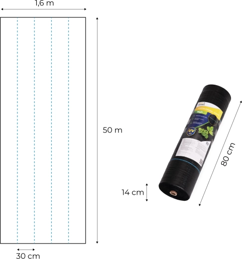 Takket være UV-stabilisering og den stærke polypropylenstruktur modstår den rivning og vejrpåvirkninger i mange sæsoner. Blå retningslinjer for hver 30 cm gør afstandsplanlægning lettere og arbejdsgangen hurtigere i haven. De medfølgende pløkker holder dugen sikkert på plads, selv i blæsevejr.