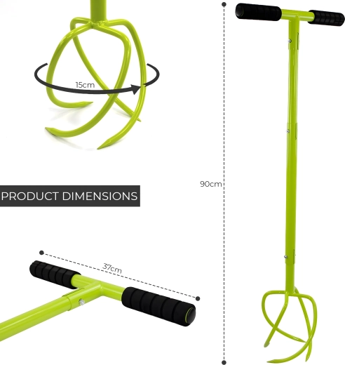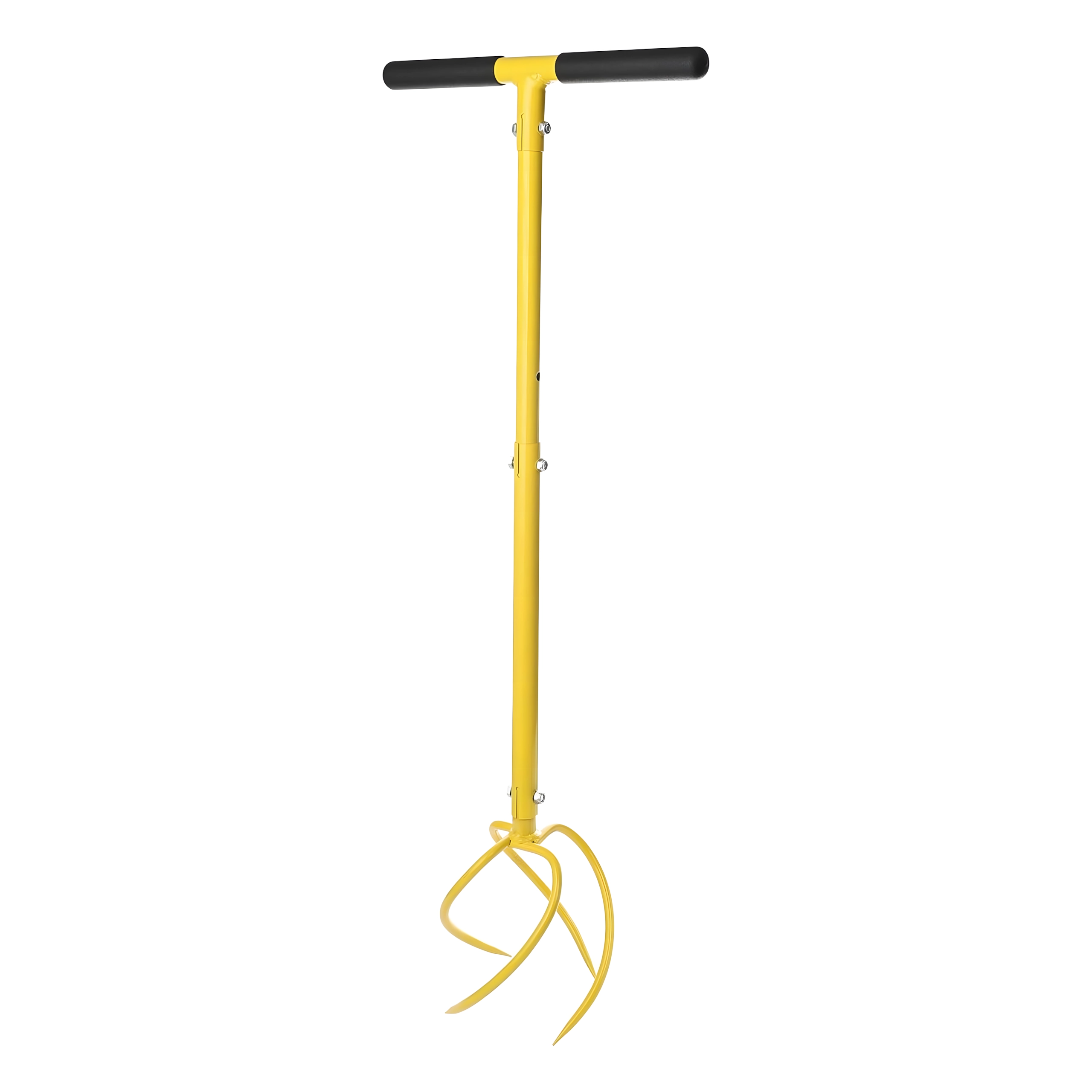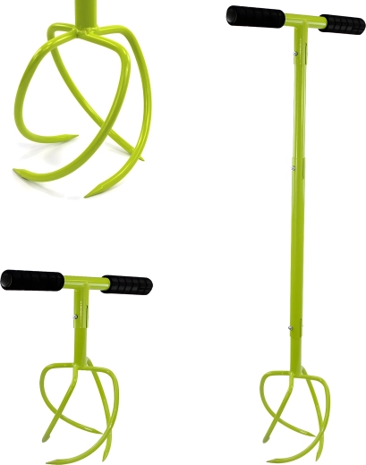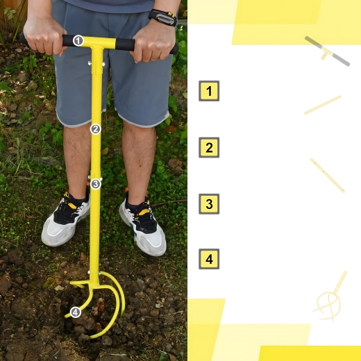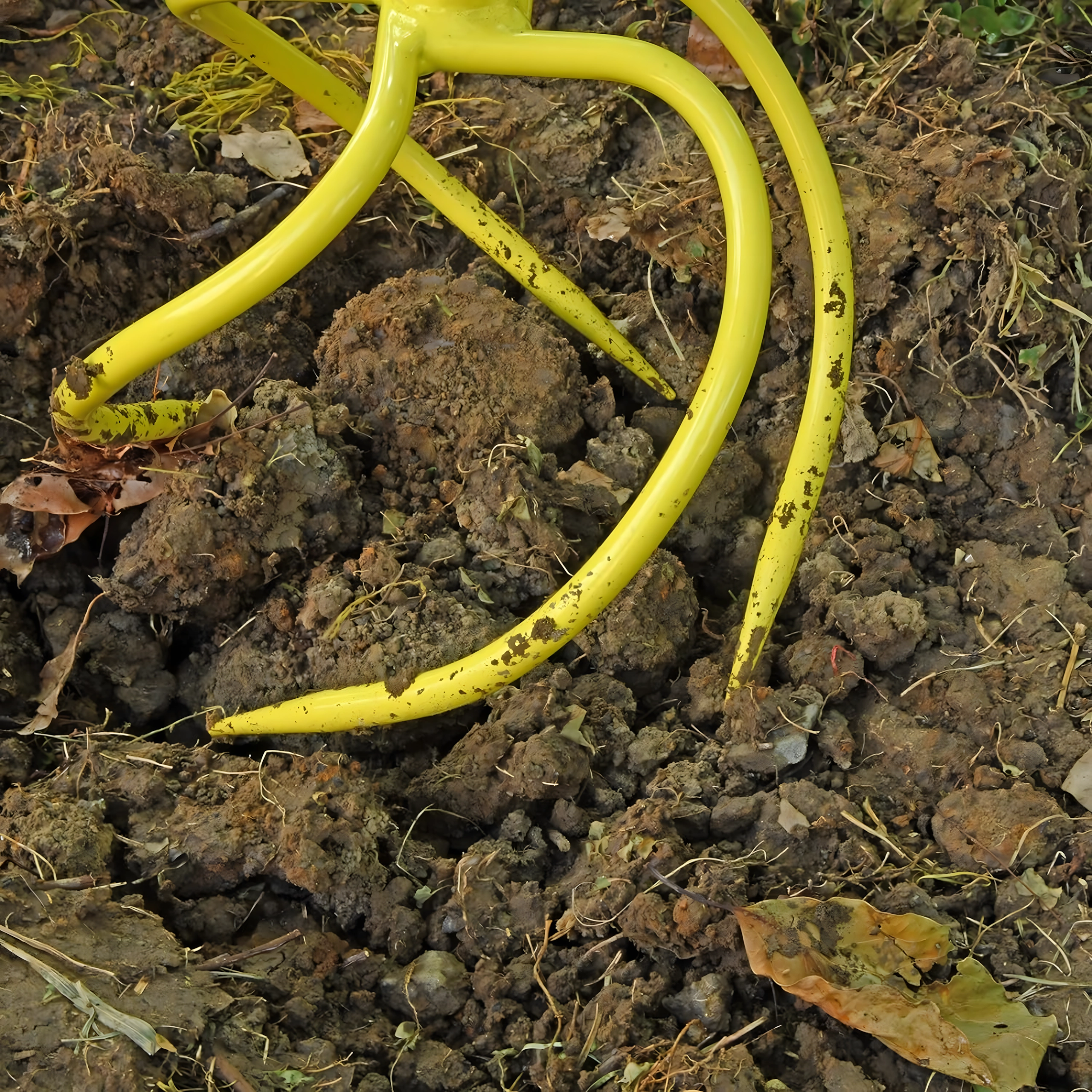 Den robuste metalkonstruktion med buede/spiralformede tænder trænger ned i jorden, knuser knolde og hjælper med at nedarbejde kompost eller gødning. Den klare farve på værktøjet øger synligheden i haven, så du altid let finder det.