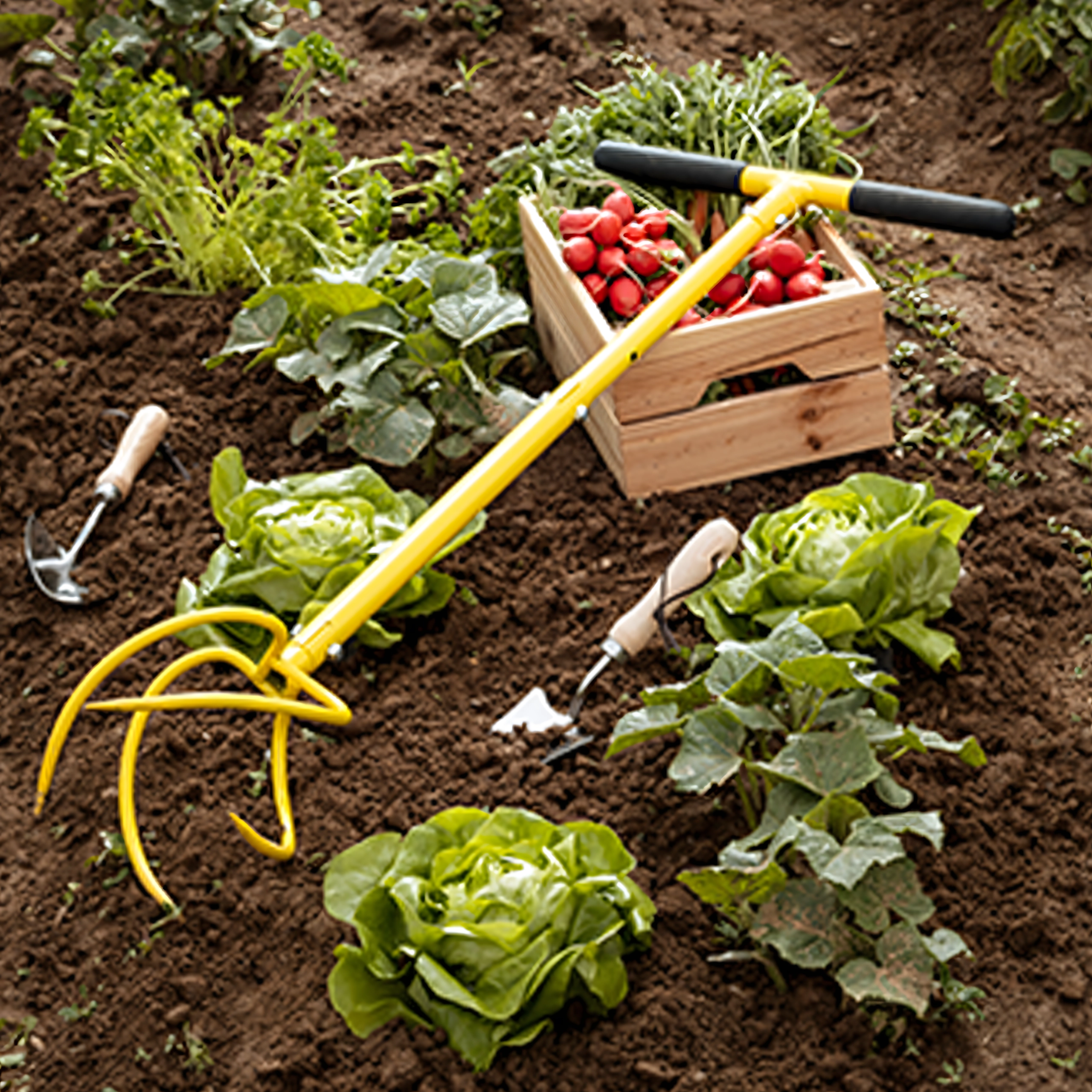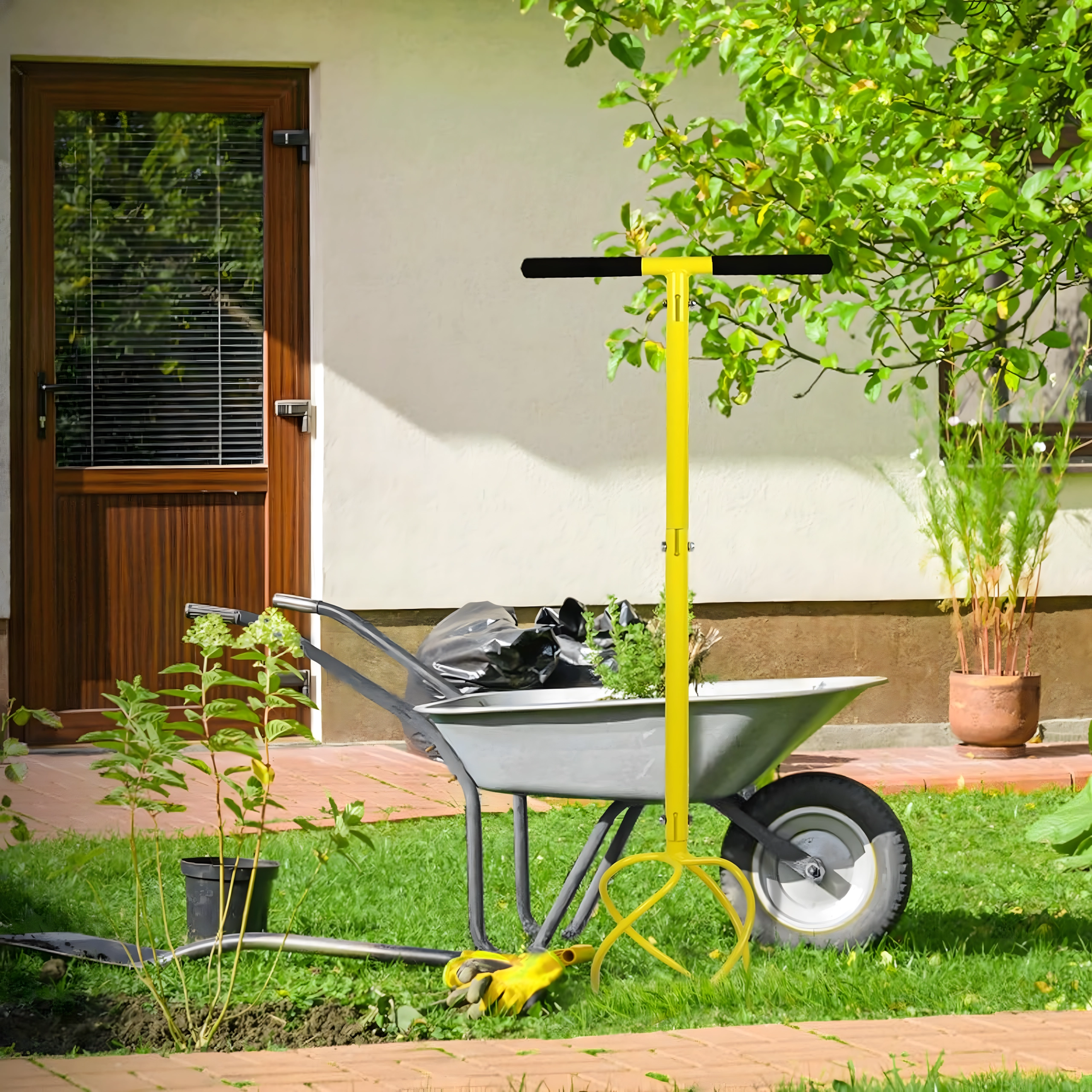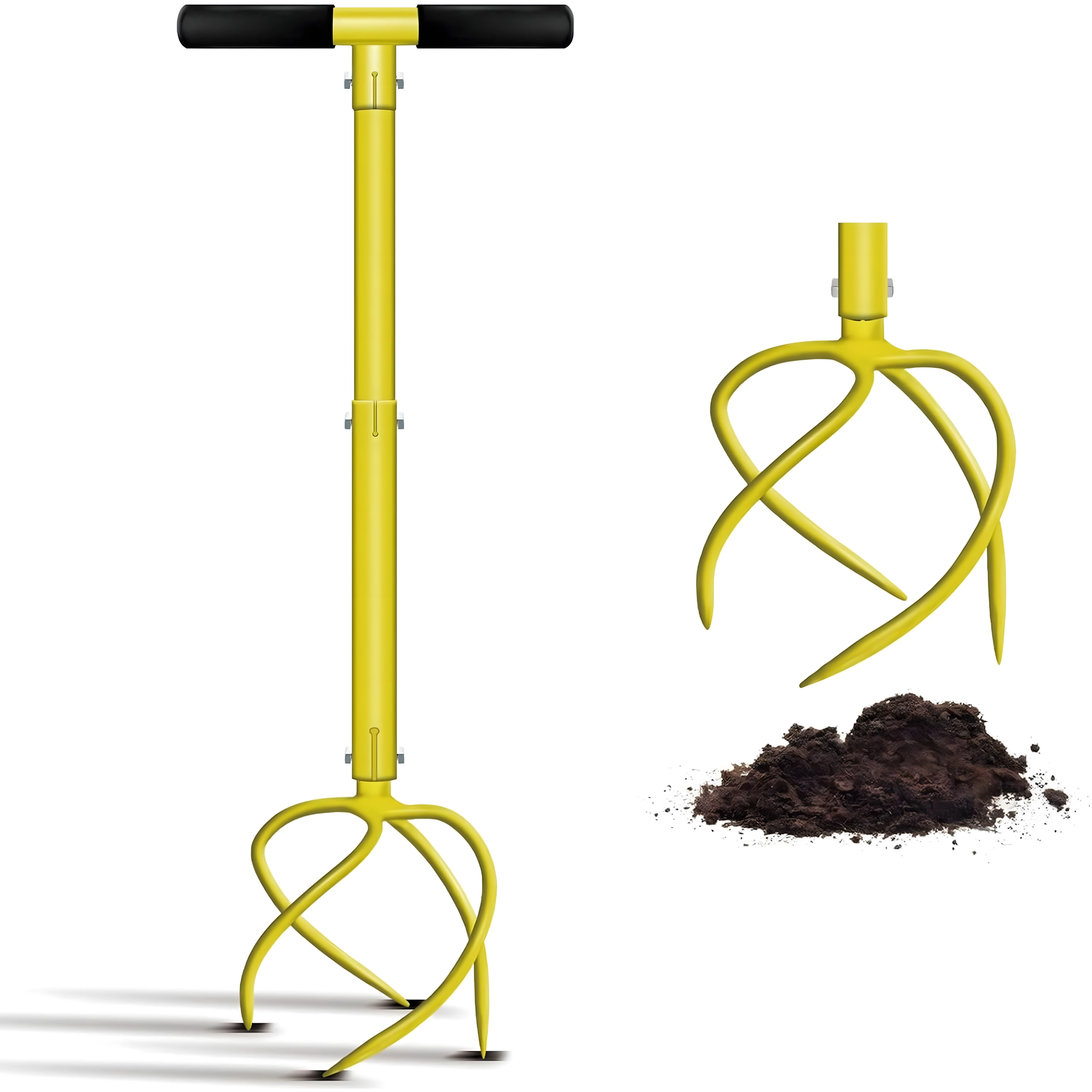 Den robuste metalkonstruktion med buede/spiralformede tænder trænger ned i jorden, knuser knolde og hjælper med at nedarbejde kompost eller gødning. Den klare farve på værktøjet øger synligheden i haven, så du altid let finder det.