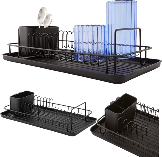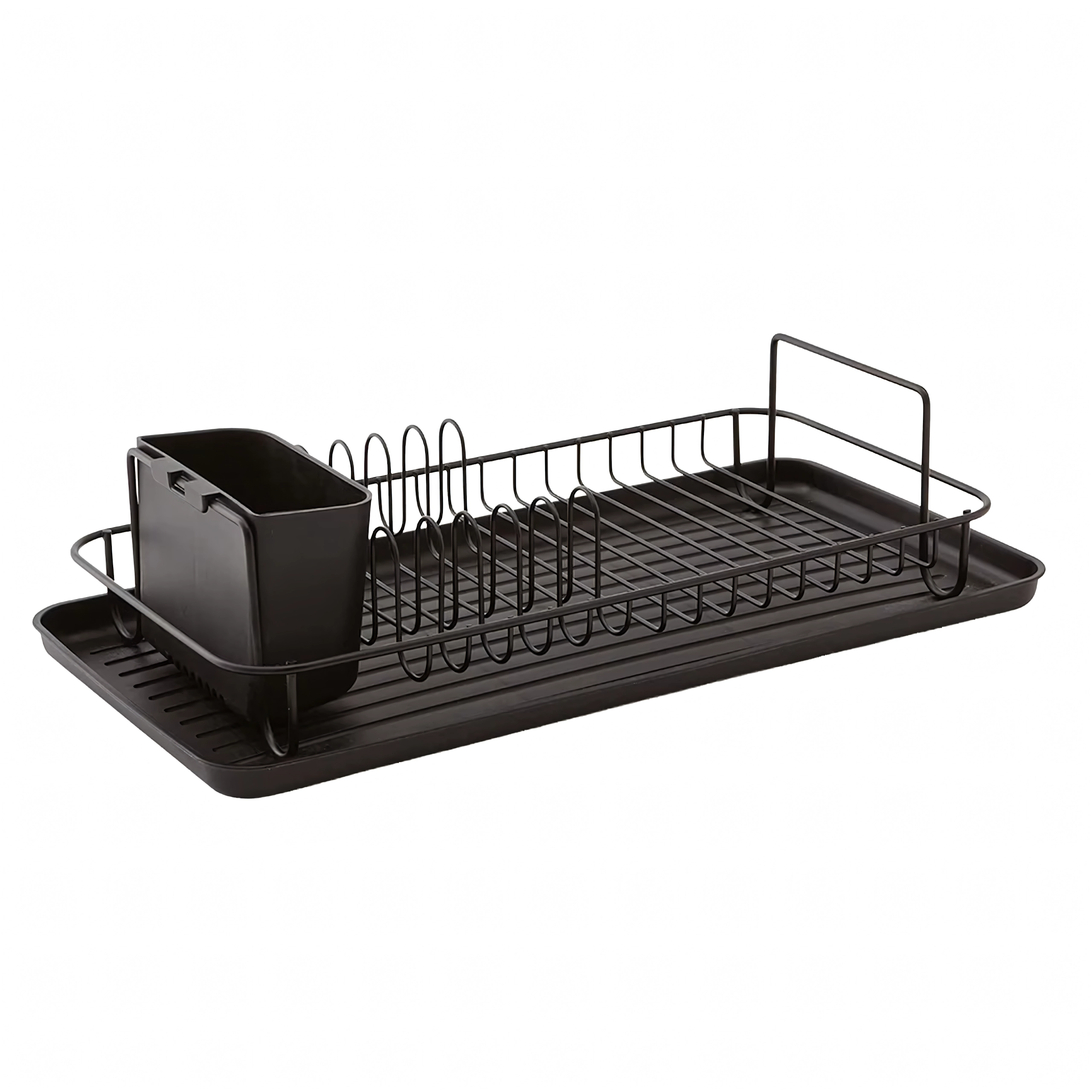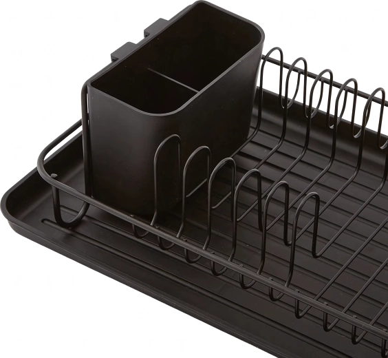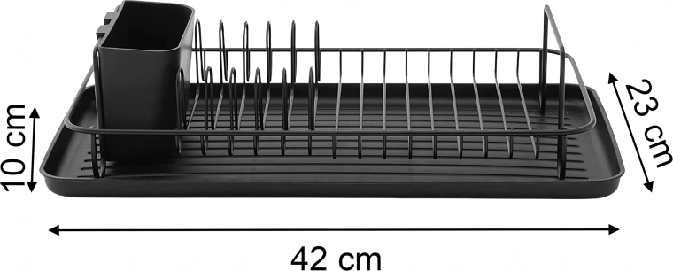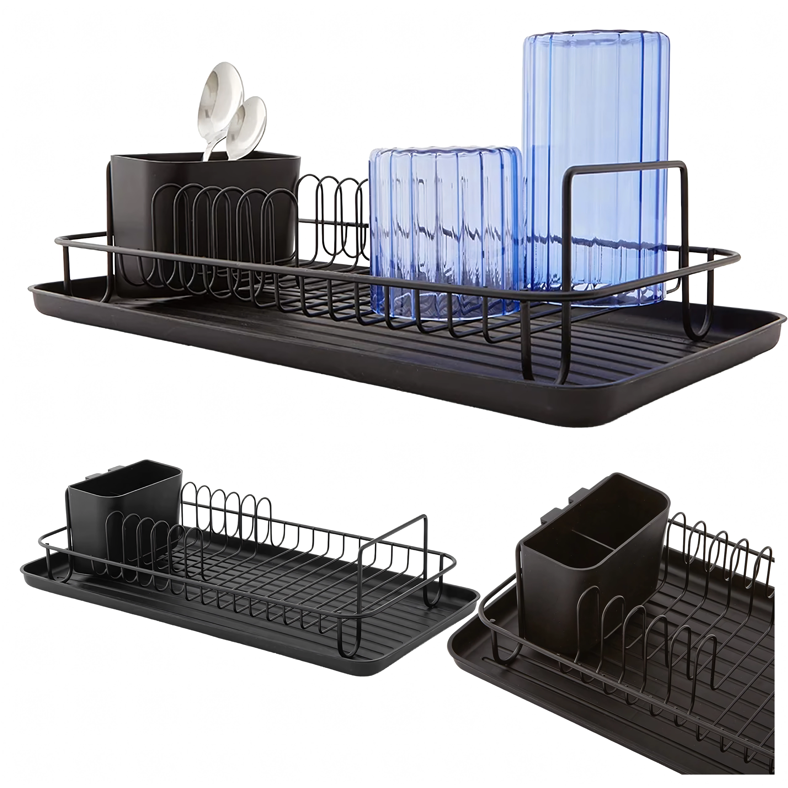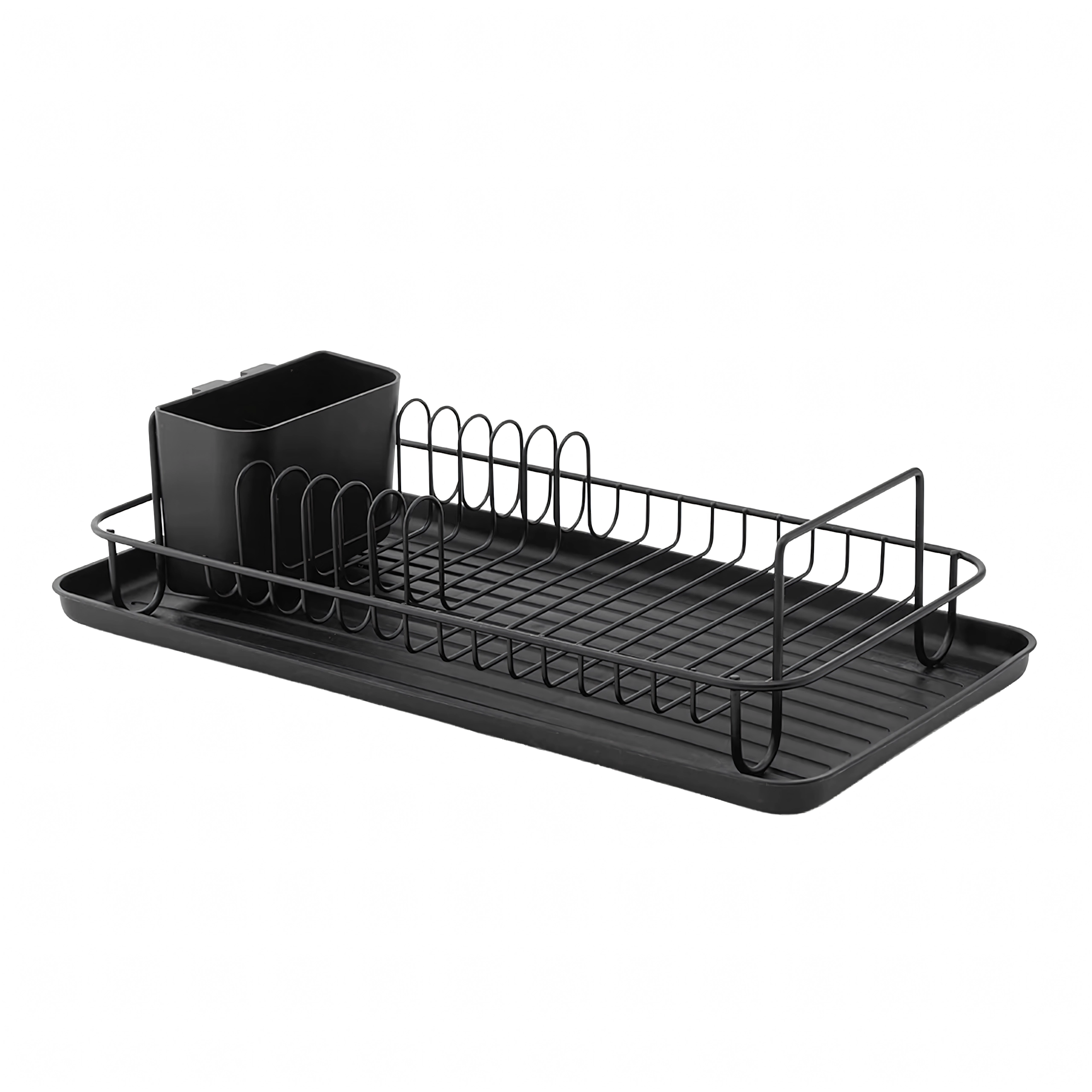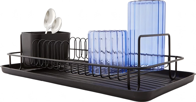 Elegant sort opvaskestativ med metalramme og aftagelig drypbakke holder køkkenbordet rent og tørt. Rillerne til tallerkener holder servicen sikkert lodret, sideområdet er velegnet til kopper eller skåle, og den separate bestikholder sørger for overskuelig opbevaring af gafler, knive og skeer.