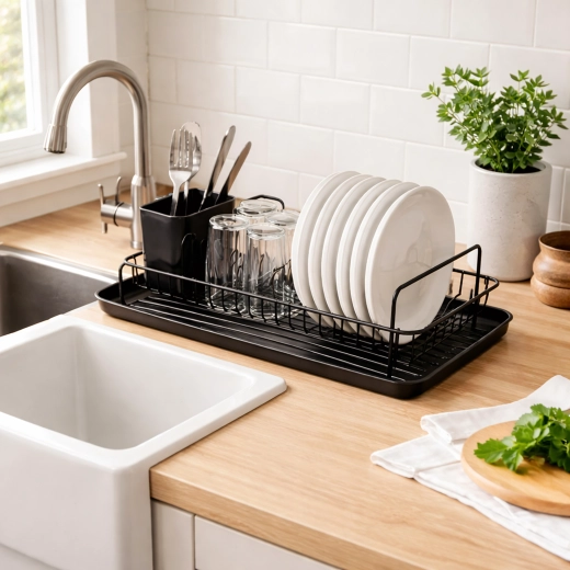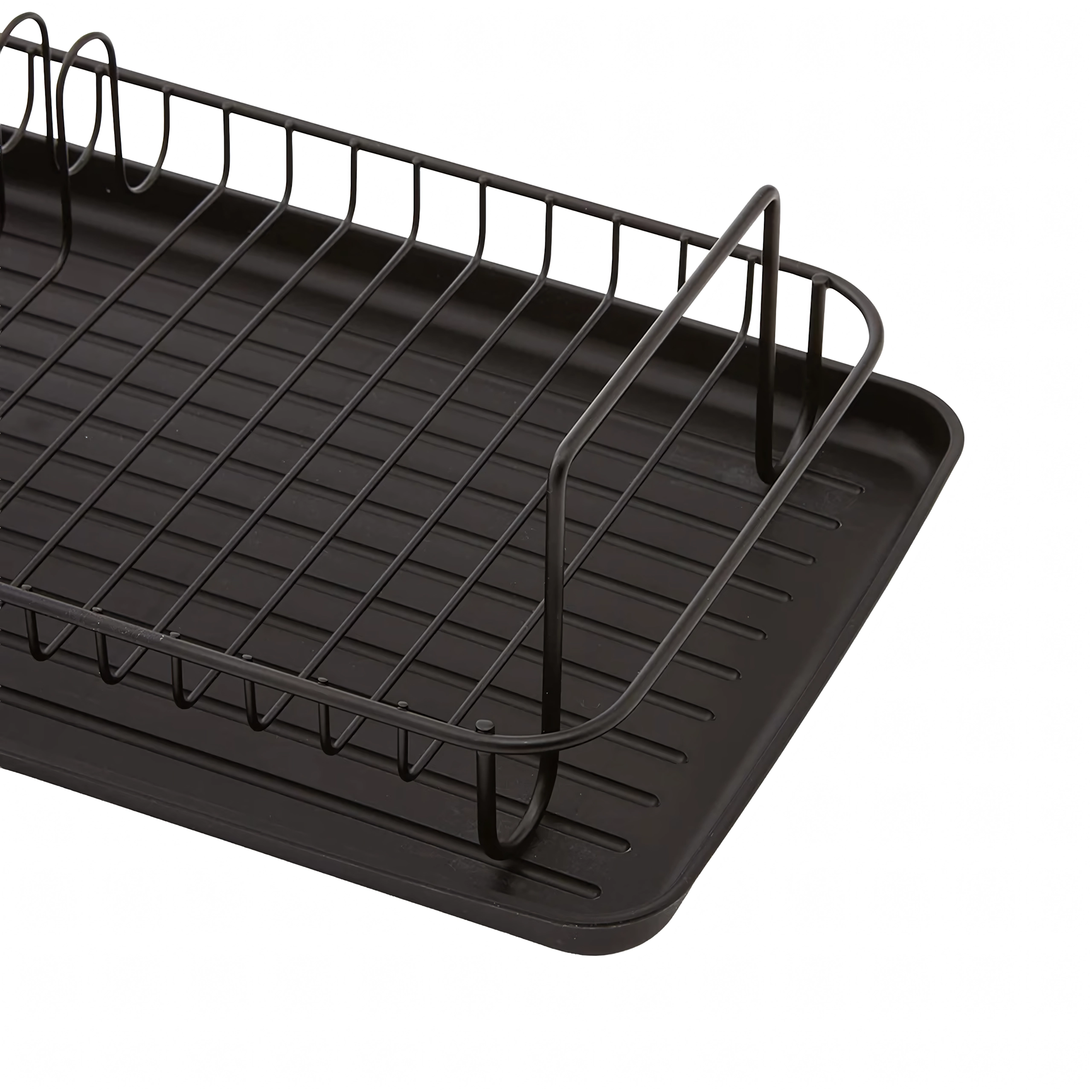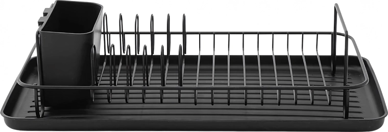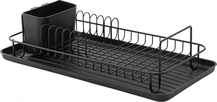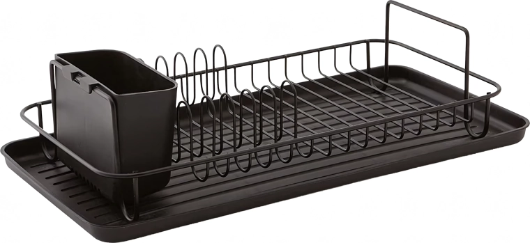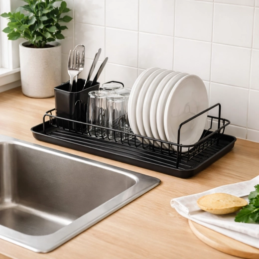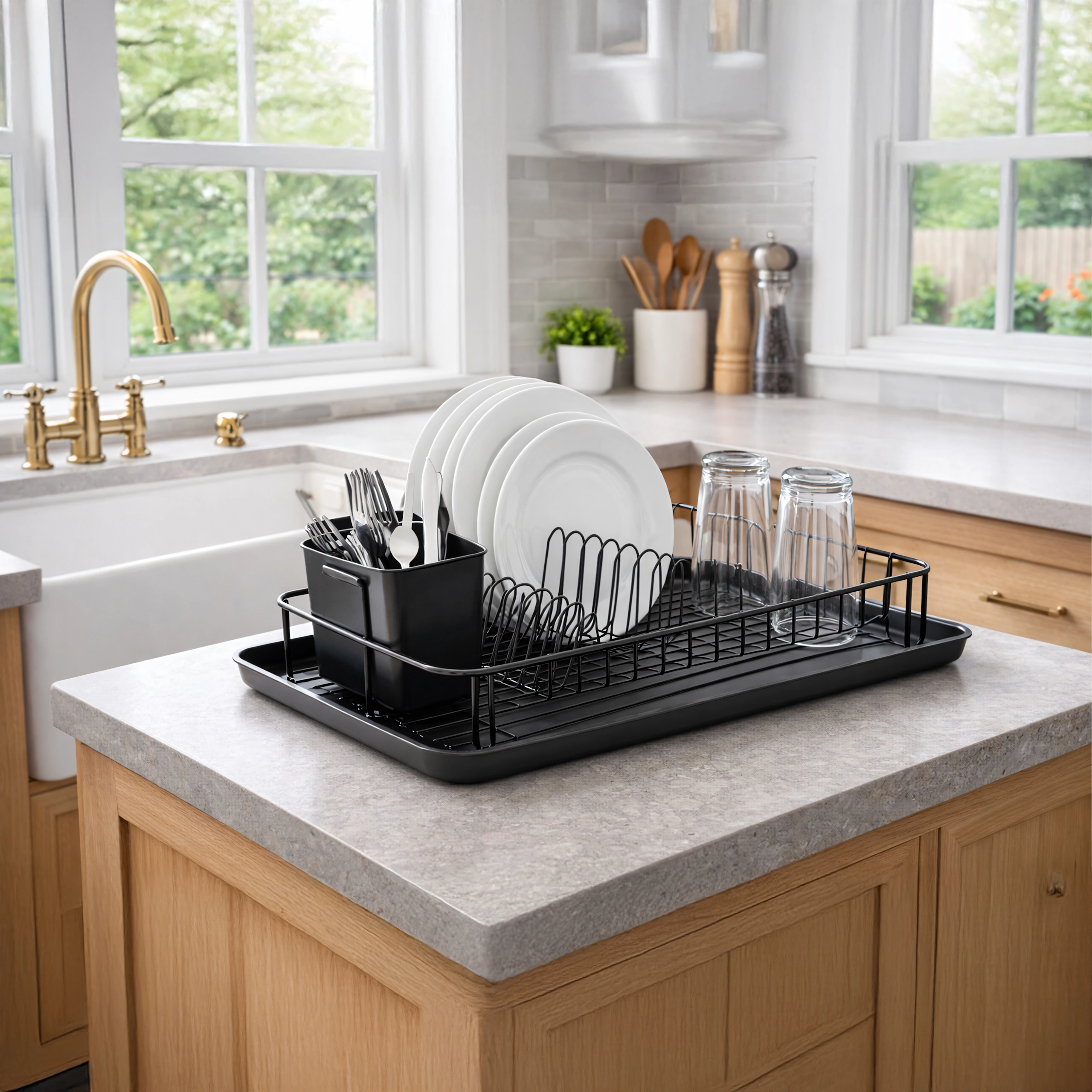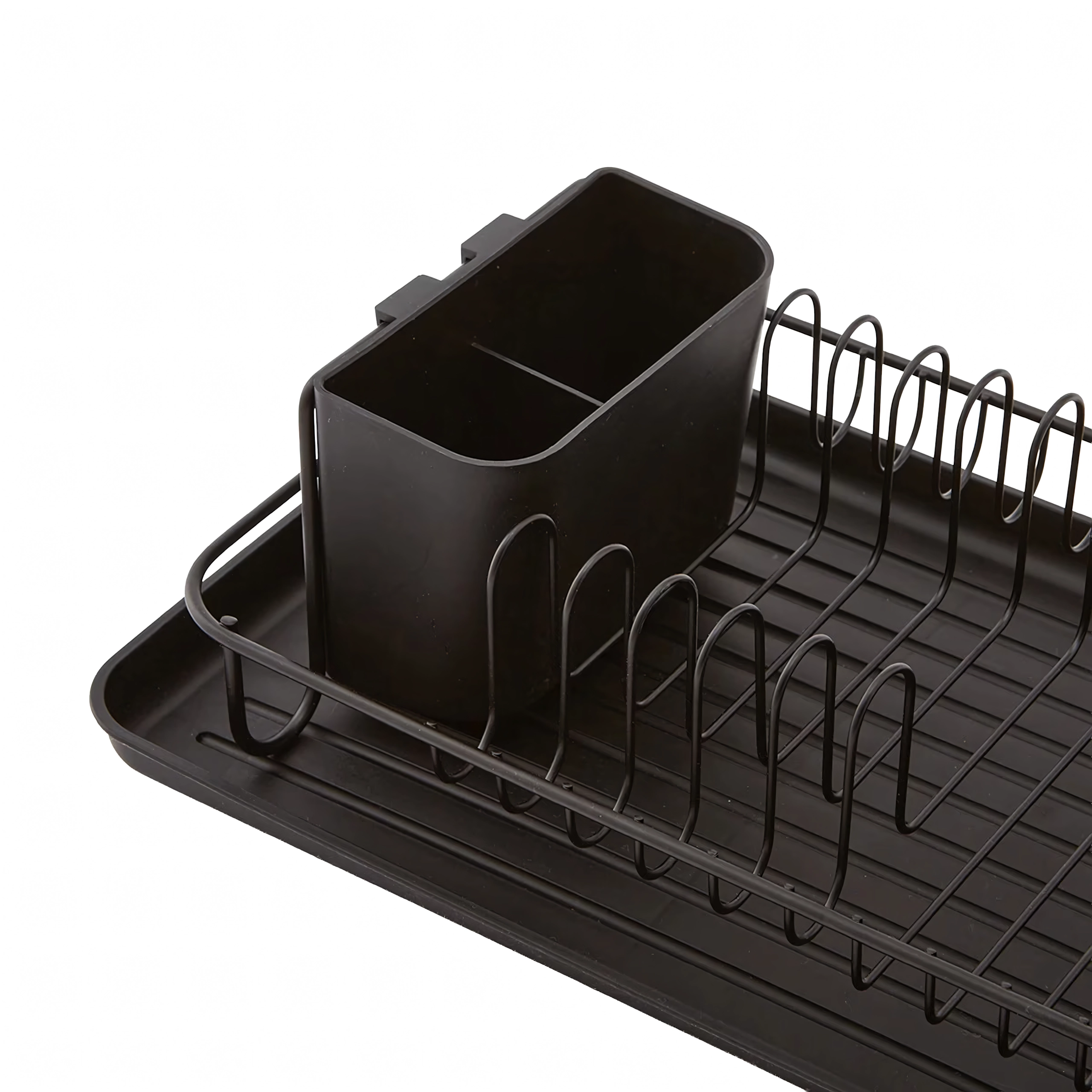 Elegant sort opvaskestativ med metalramme og aftagelig drypbakke holder køkkenbordet rent og tørt. Rillerne til tallerkener holder servicen sikkert lodret, sideområdet er velegnet til kopper eller skåle, og den separate bestikholder sørger for overskuelig opbevaring af gafler, knive og skeer.