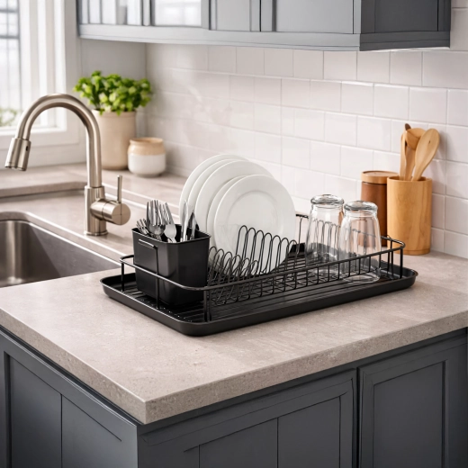 Vertikale trådriller holder tallerkener lodret, mens sidezonen rummer kopper eller skåle. Den åbne konstruktion fremmer luftgennemstrømningen.