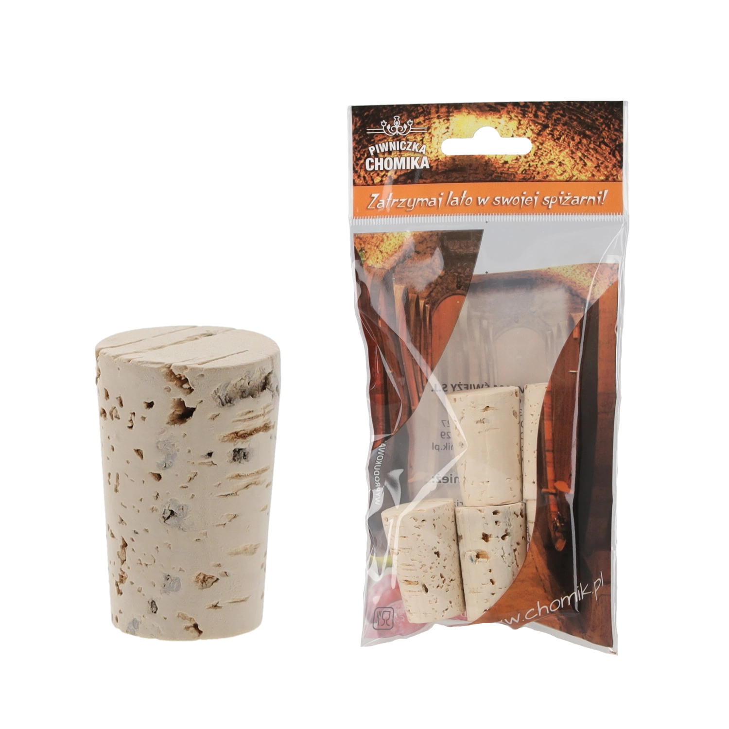 Praktisk sæt med fem kegleformede korkpropper med en diameter på 25 mm til pålidelig lukning af flasker og damejeanner. Fremstillet af naturlig kork for miljøvenlig og sikker brug i kontakt med fødevarer. Takket være den tætte lukning beskytter de drikkevarer mod oxidation og forurening og hjælper med at bevare friskhed og aroma i hjemmelavede vine, likører og andre drikke.
