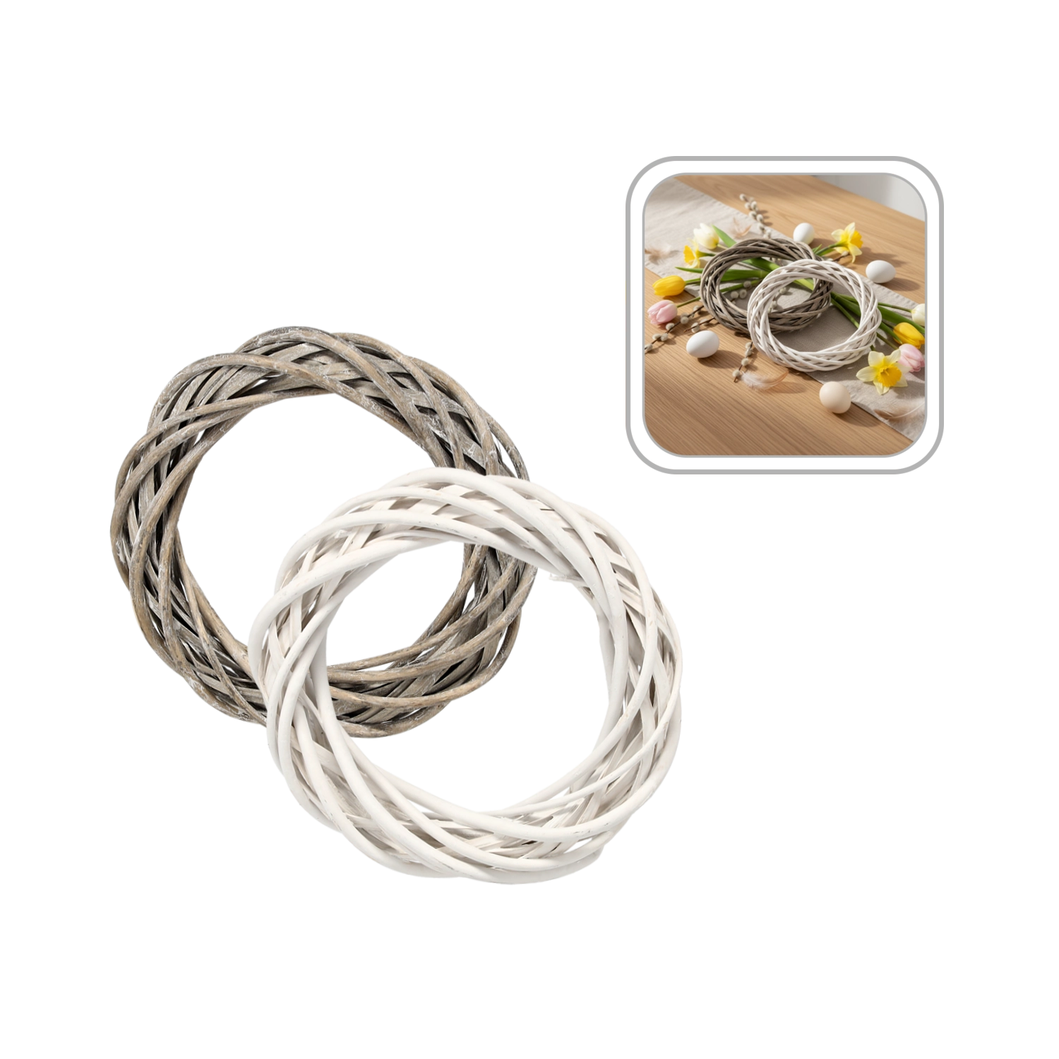 Skab en original dekoration på ingen tid. Denne pilefletkrans i tidløse, neutrale nuancer af hvid eller grå passer til både moderne og rustikke interiører. Den er robust, let og klar til at blive pyntet efter din fantasi – fra forårsblomster over efterårsløv til juleornamenter.