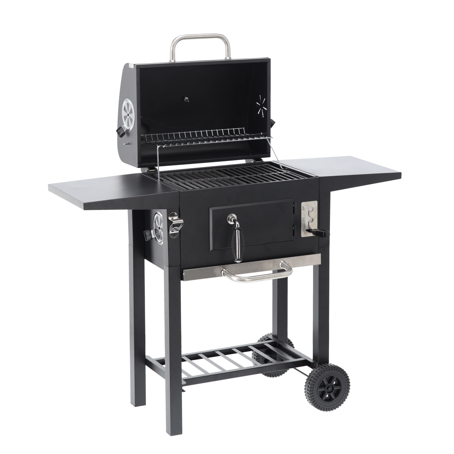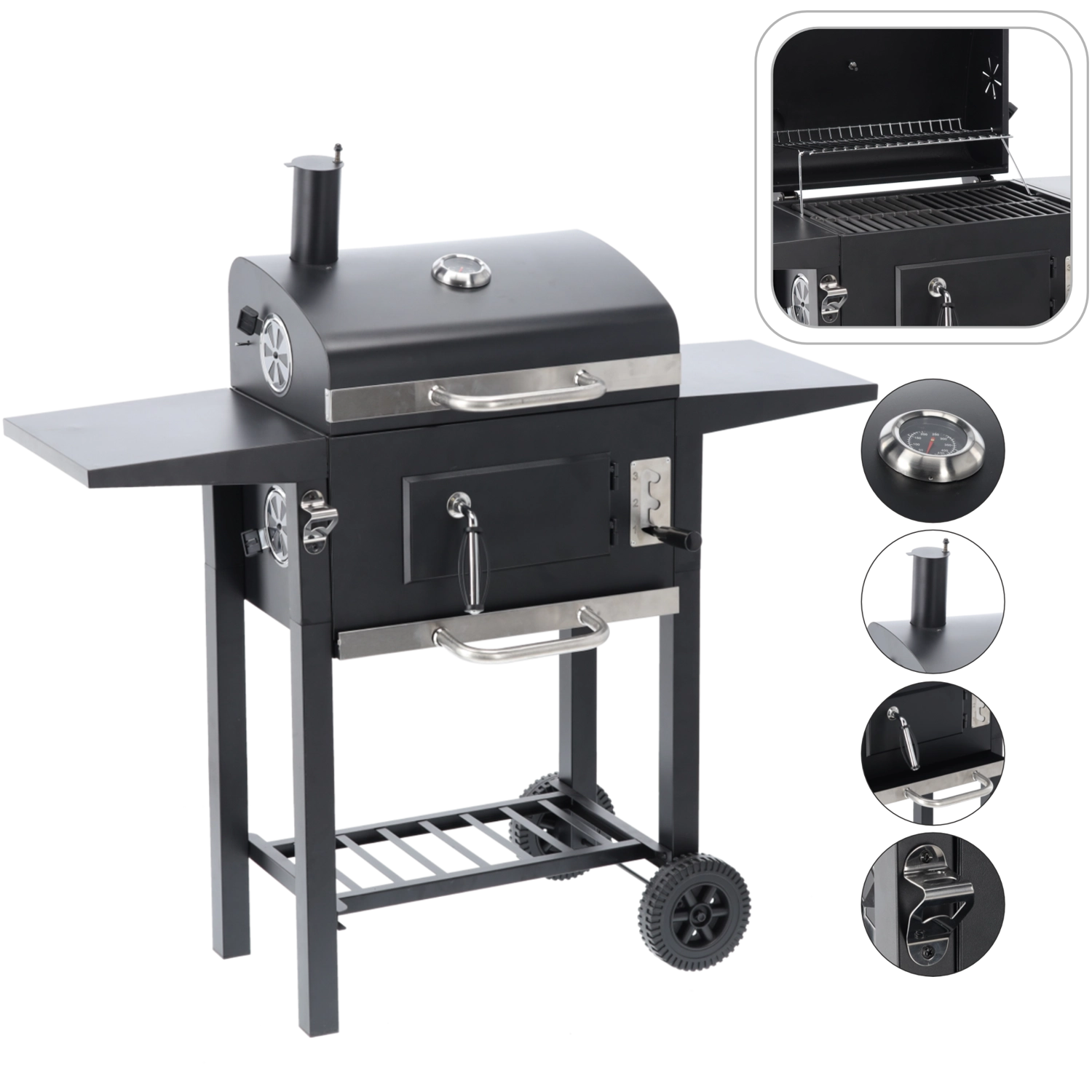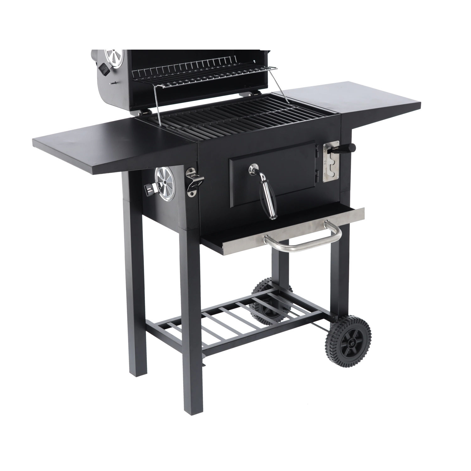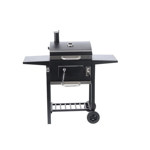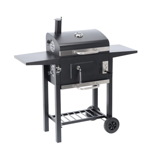 To robuste hjul, sideaflægningsflader og en nederste hylde til briketter sikrer nem flytning og praktisk plads under grillningen.