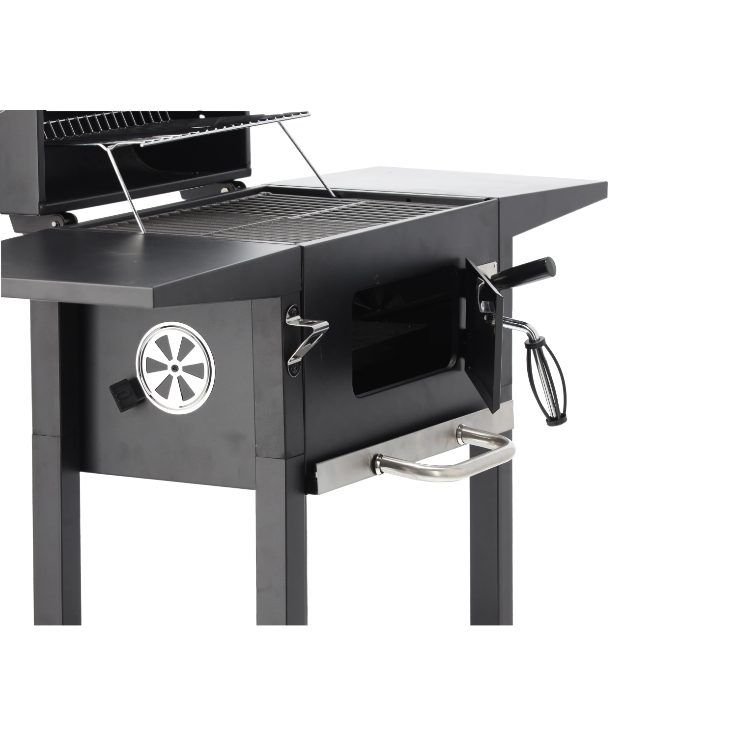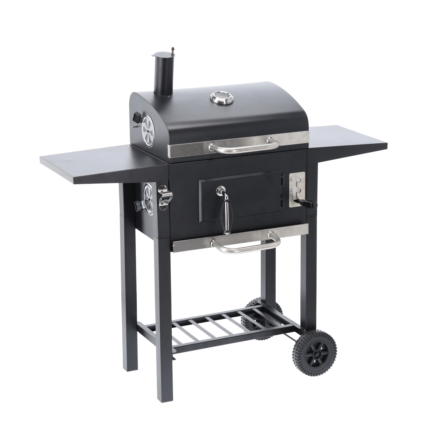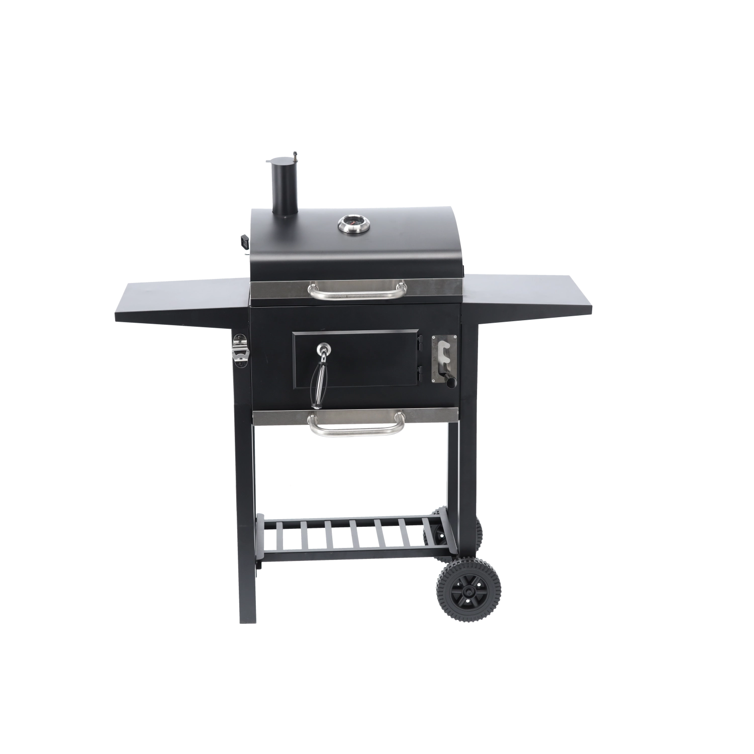 To robuste hjul, sideaflægningsflader og en nederste hylde til briketter sikrer nem flytning og praktisk plads under grillningen.