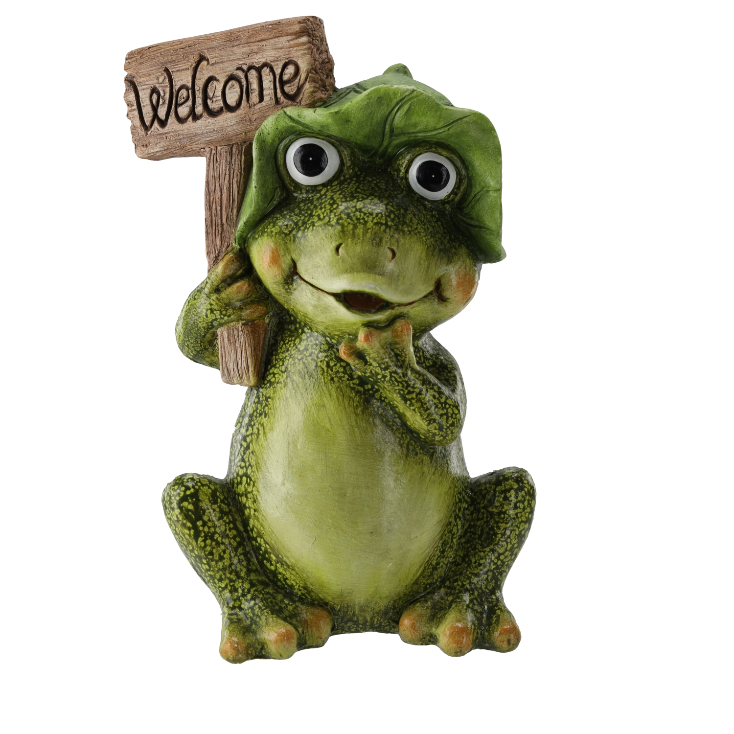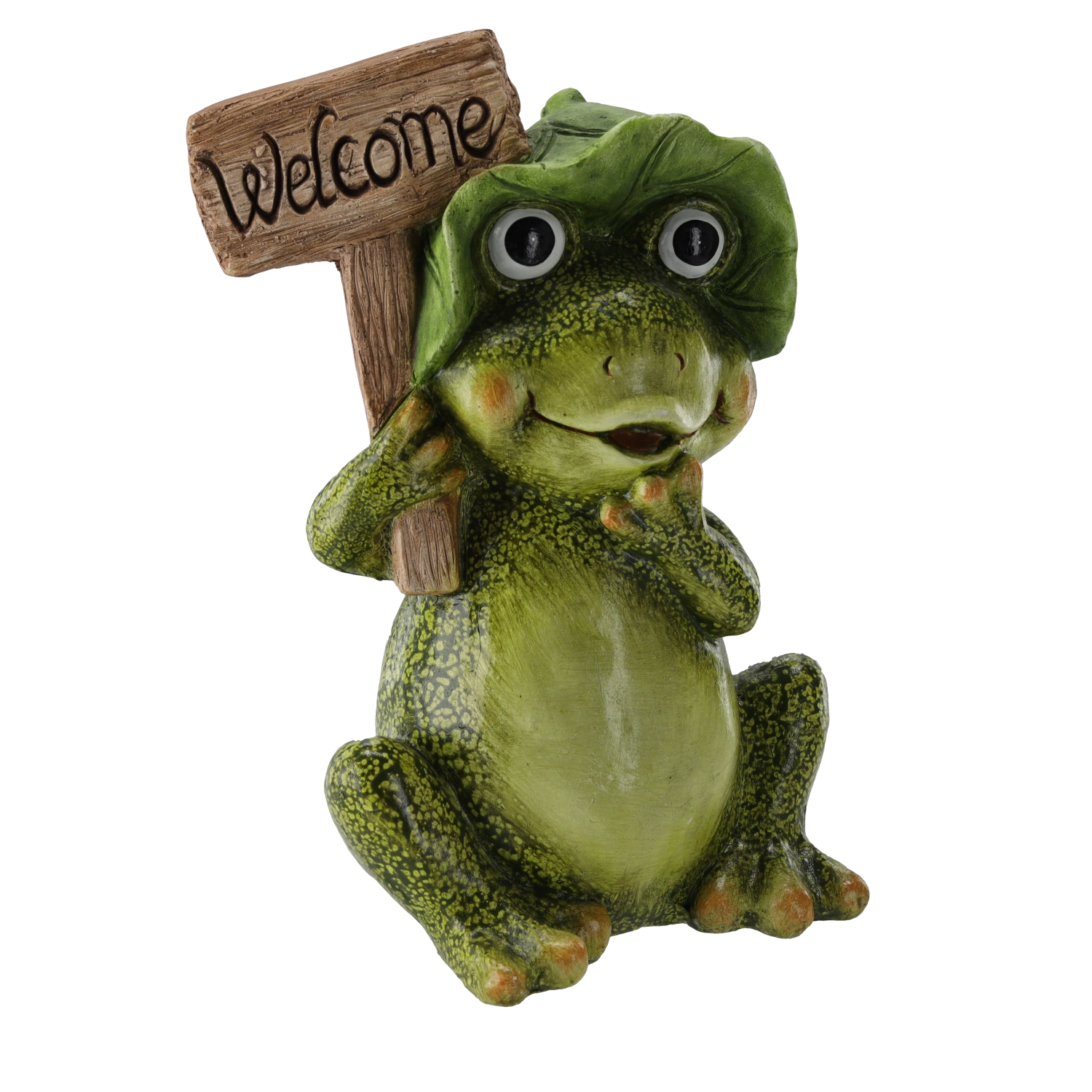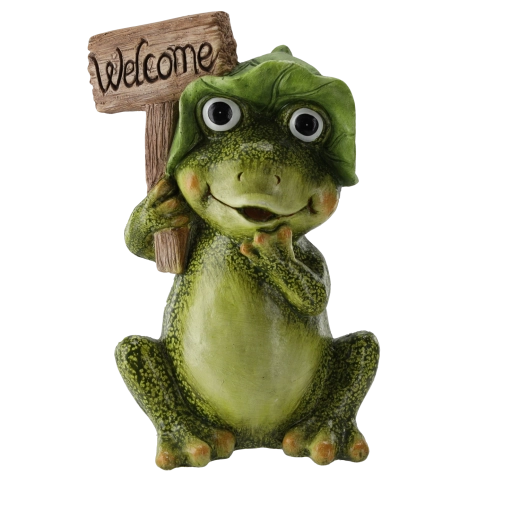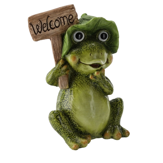 Frøen holder et træskilt med teksten “Welcome”, som giver indgangen eller siddeområdet en hyggelig atmosfære og en venlig velkomst.