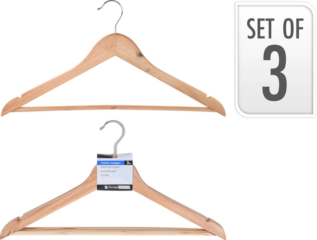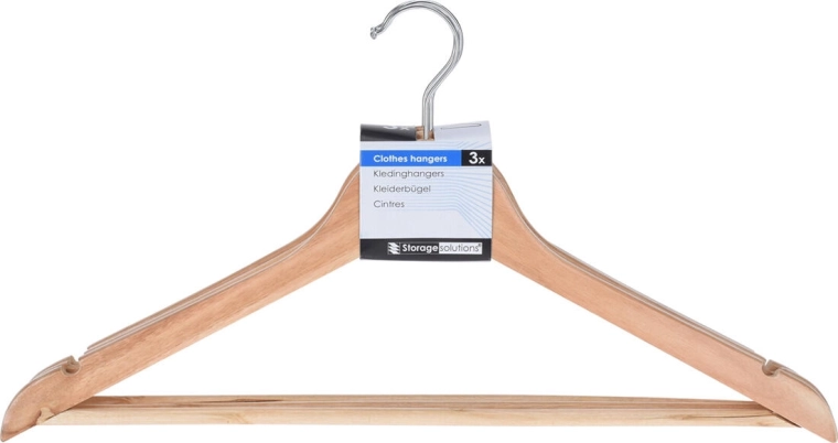Praktisk sæt med træbøjler til overskuelig opbevaring af tøj i garderoben. Holdbart naturligt træ sikrer lang levetid og stabilitet, pakken indeholder 3 stk.