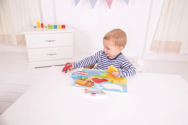 Sjovt træindsætningspuslespil med transportmidler til de mindste. Indeholder 5 store brikker med greb, som børn nemt kan lægge i de rigtige udskæringer. Understøtter finmotorik, koordination, lære former og farver samt udvikling af ordforråd. Fremstillet af kvalitetstræ og opfylder europæiske sikkerhedsstandarder.