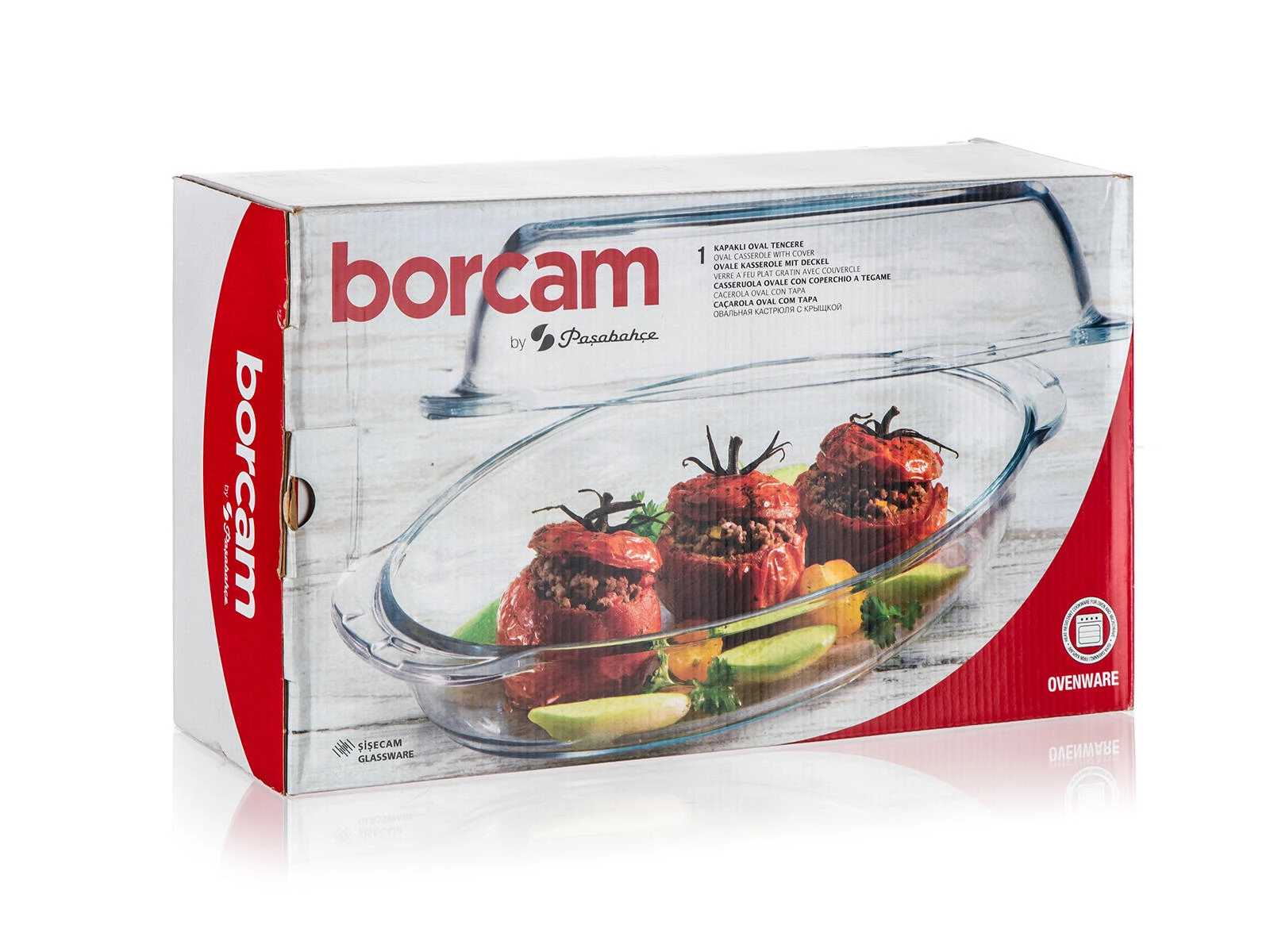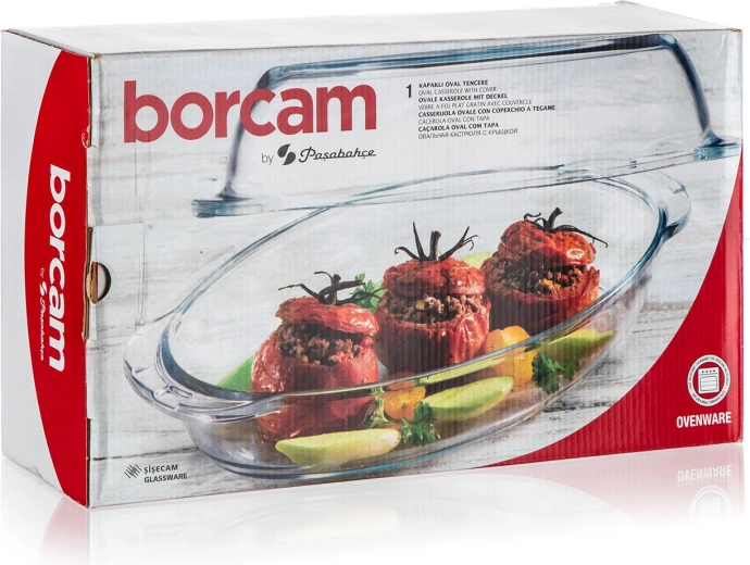 Praktisk oval bradepande af varmebestandigt borosilikatglas med en kapacitet på 4 l (fad 2,2 l + låg 1,8 l) til bagning, gratinering og servering. Tåler temperaturer fra -50 til 500 °C, er hygiejnisk, ikke-porøs, let at rengøre og kan tåle opvaskemaskine.