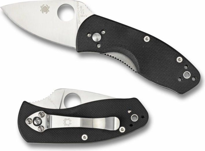 Åbningen er hurtig og intuitiv via det karakteristiske tommelhul i Spyderco-stil. Liner Lock-låsen holder klingen sikkert i arbejdsposition. Det ergonomiske skæfte i sort G10-laminat giver et sikkert greb, suppleret af et klips til lommebæring og et hul til paracord eller ophængssnor.