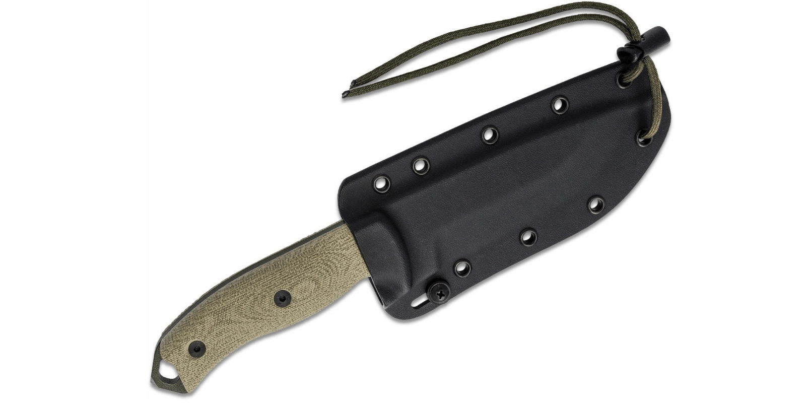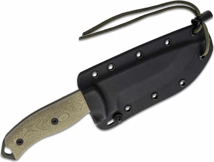 Det teksturerede Micarta-greb i grøn ligger sikkert i hånden, selv når det er vådt. Et øje til paracord udvider mulighederne for sikring eller ophængning. I pakken medfølger en sort Kydex-bælteskede, som giver hurtig adgang og sikker opbevaring af kniven.