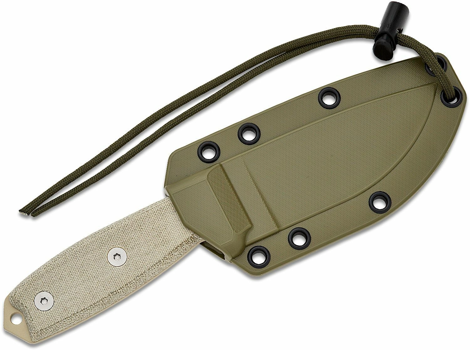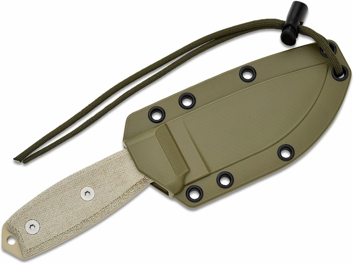 Micarta-skæftet i sandbrun udførelse giver et sikkert greb både med handsker og i vådt miljø. Enden af skæftet er udstyret med hul til paracord og en praktisk glasknuser. En grøn plastskede OD Green medfølger, som beskytter klingen og muliggør komfortabel bæring.
