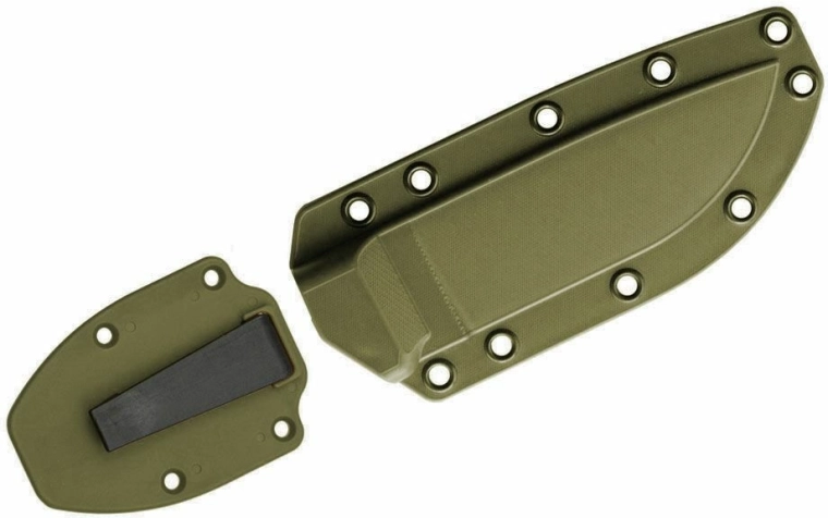 Det sandbrune Micarta-skæfte ligger fremragende i hånden, glider ikke og giver et sikkert greb selv under krævende forhold. Medfølgende er en grøn plastskede med mulighed for montering på udrustning, så kniven altid er sikker og nem at have ved hånden.
