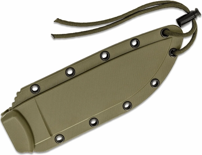 Full tang-konstruktionen sikrer høj styrke i hele knivens længde. Det grønne micarta-skæfte ligger godt i hånden også i fugt, og takket være hullet til snor kan du sikre kniven eller udvide grebet. I pakken medfølger en holdbar polymer-skede til sikker og hurtig opbevaring.
