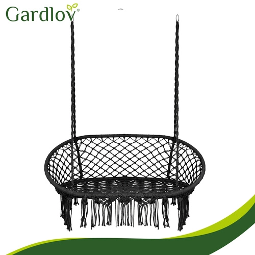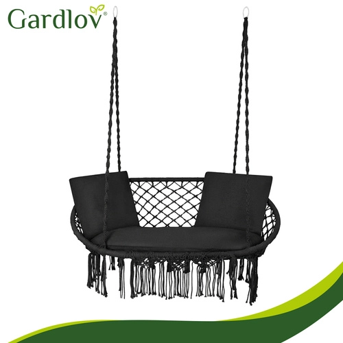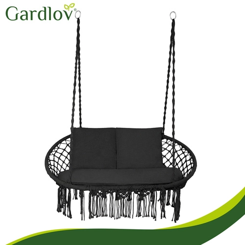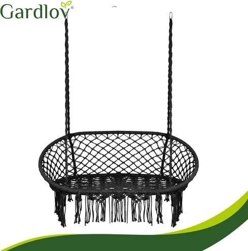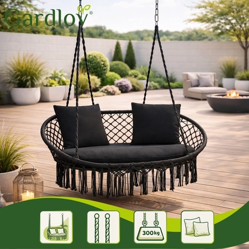 Hængestolen GARDLOV forvandler dit udendørs- og indendørs afslapningshjørne til et hyggeligt sted at slappe af. Det dobbelte sæde med bløde puder støtter ryggen behageligt og giver komfortabel siddestilling og halvliggende position, mens de dekorative macramé-frynser tilfører et moderne boho-look.