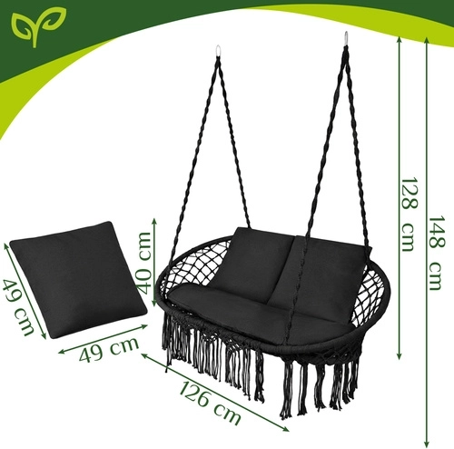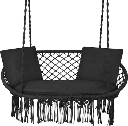 Nyd stunder af ro og velvære i haven, på terrassen eller altanen. Denne rummelige hængestol til to har et bredt sæde, maks. belastning op til 300 kg, 3 bløde puder og et stilfuldt boho-design med frynser. Takket være den stærke metalramme og holdbare reb med metalringe er ophængningen stabil og sikker – til afslapning for to eller alene.