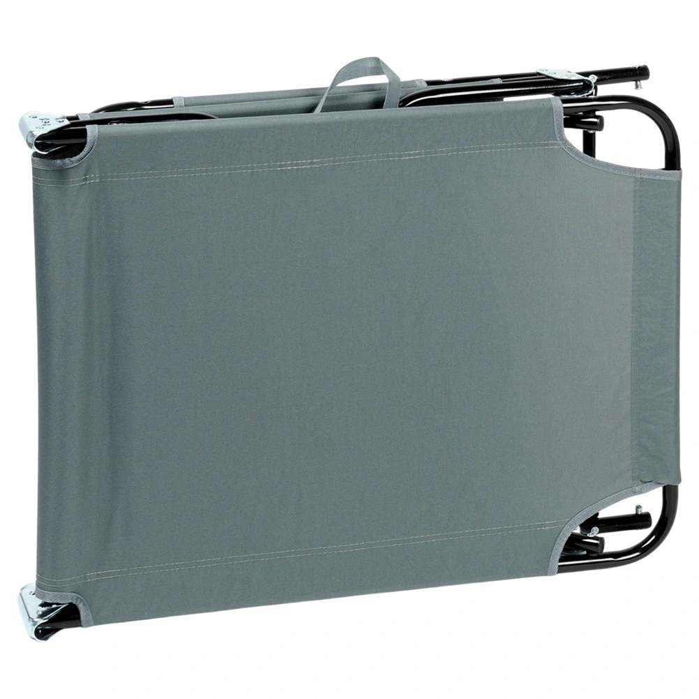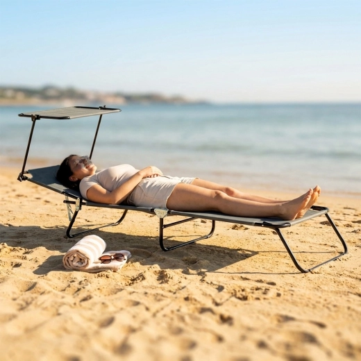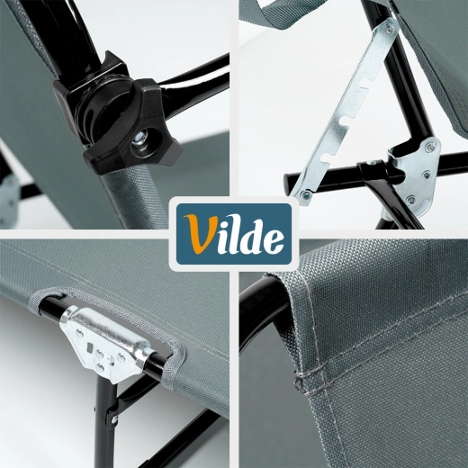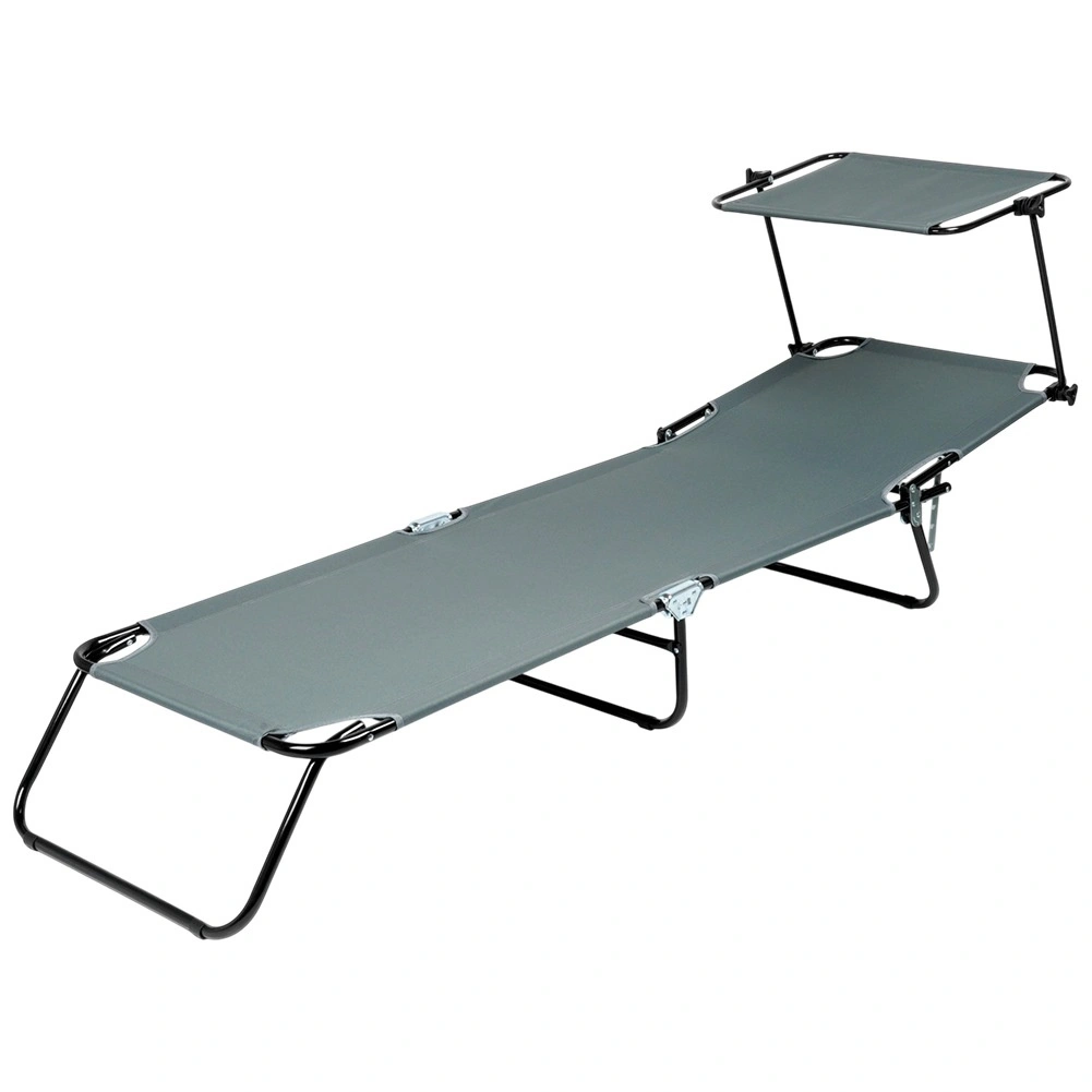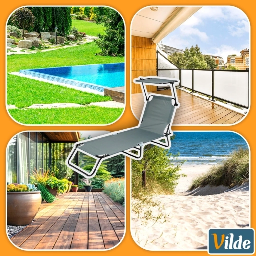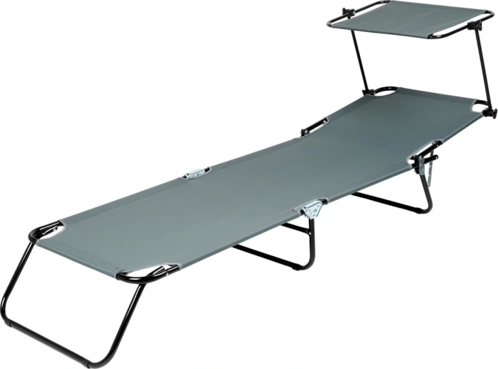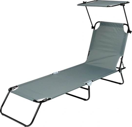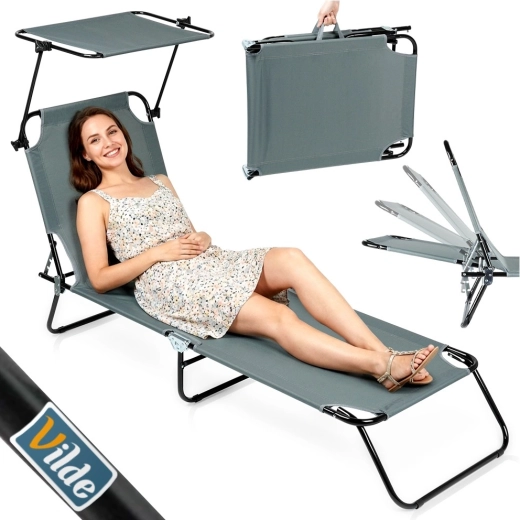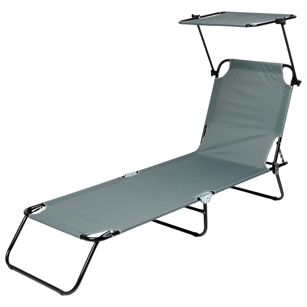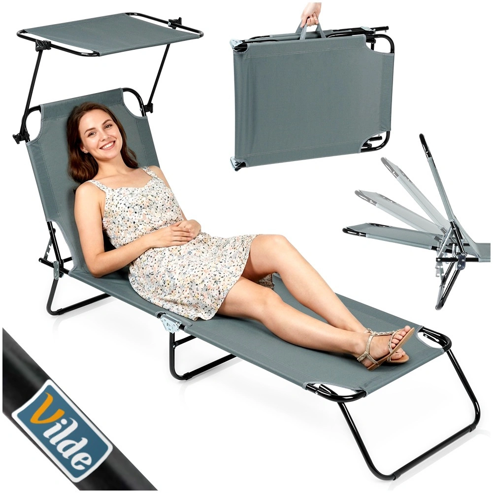 Nyd afslapning i frisk luft med en grå havestol med fire justerbare positioner, inklusive fuldt liggeleje, samt en justerbar solskærm, der beskytter mod solen. Takket være den robuste metalkonstruktion og det slidstærke polyestermateriale kan den bære op til 120 kg. Stolen kan hurtigt klappes sammen til kompakte mål og er let at bære til have, terrasse, altan eller strand takket være de praktiske bærehåndtag.