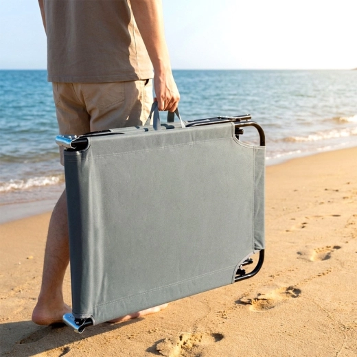 Stolen klappes sammen til kompakte mål på 72 × 55 × 16 cm. Med to greb kan du nemt tage den med til strand, camping eller altan.