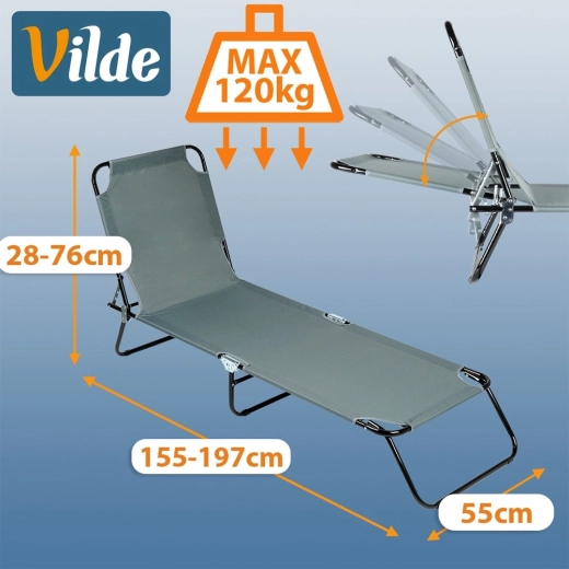 • Komfortable mål: liggeflade ca. 197 × 55 cm, højde afhængigt af position ca. 28–76 cm, bæreevne op til 120 kg.