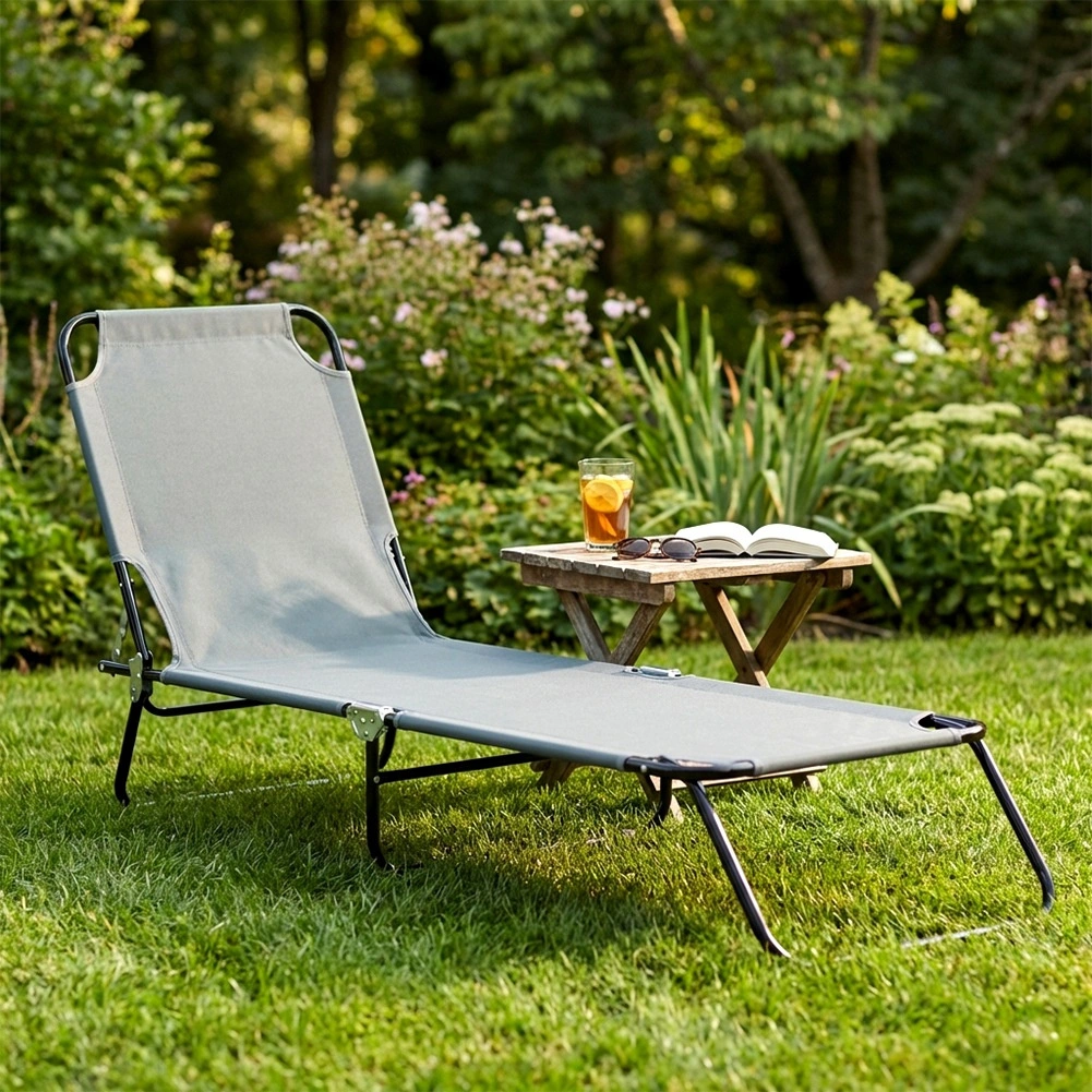 Nyd afslapning hvor som helst med en sammenklappelig havestol i elegant grå. Den tilbyder 4 justerbare positioner, inkl. helt flad, solid metalramme og bæreevne på 120 kg. Takket være de kompakte mål efter sammenklapning og praktiske bærehåndtag er den ideel til haven, terrassen, altanen samt strand og camping.