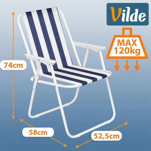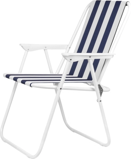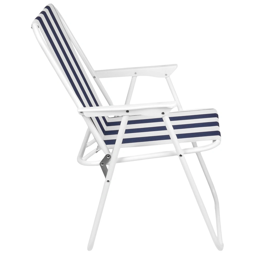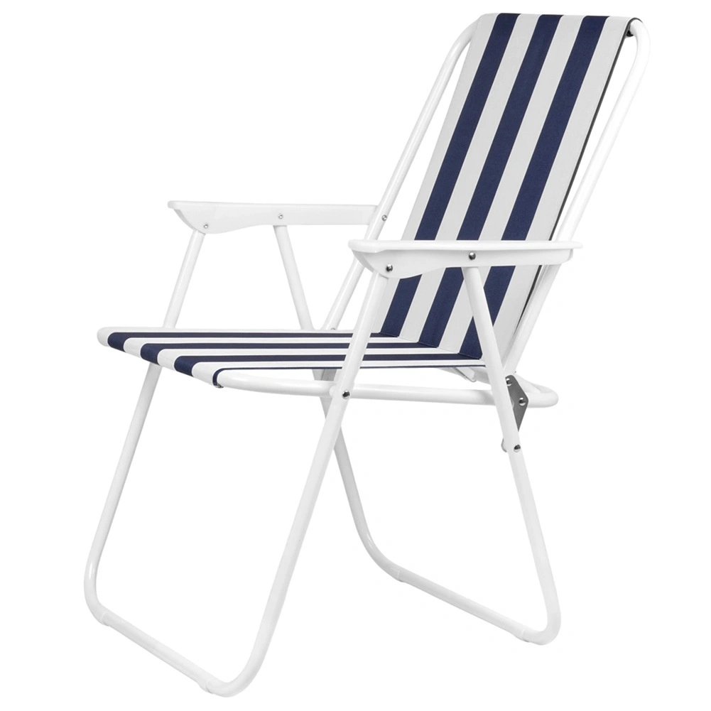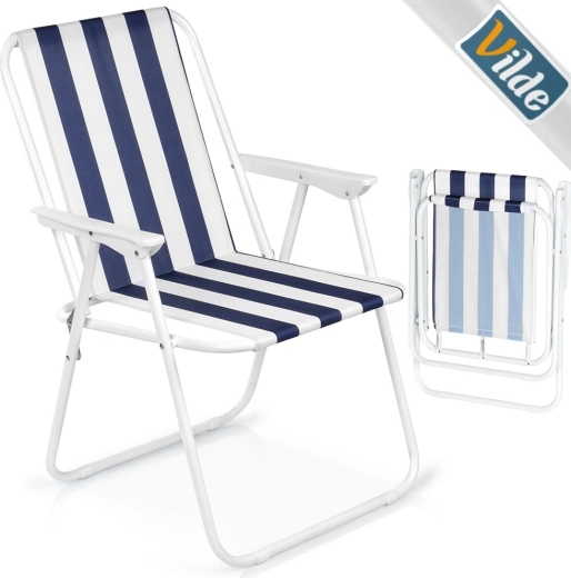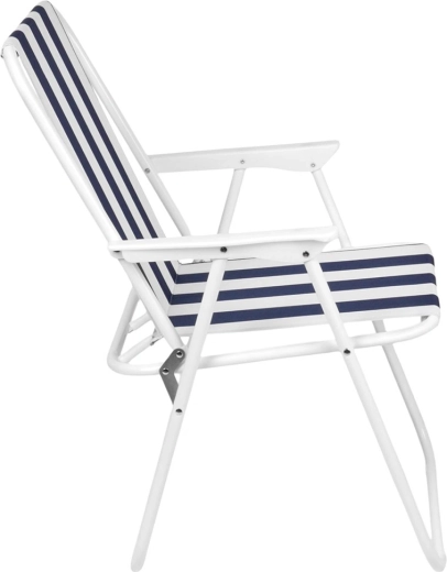 Let og bærbar sammenklappelig stol med maritime striber, ideel til strand, camping og have. Den har en solid metalkonstruktion, behagelige armlæn og kompakte mål, når den er klappet sammen, så den er let at opbevare og transportere. Maks. belastning 120 kg og slidstærkt polyesterstof sikrer lang levetid og sikker siddekomfort.