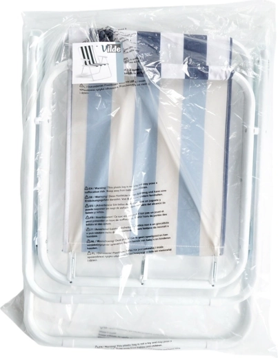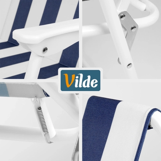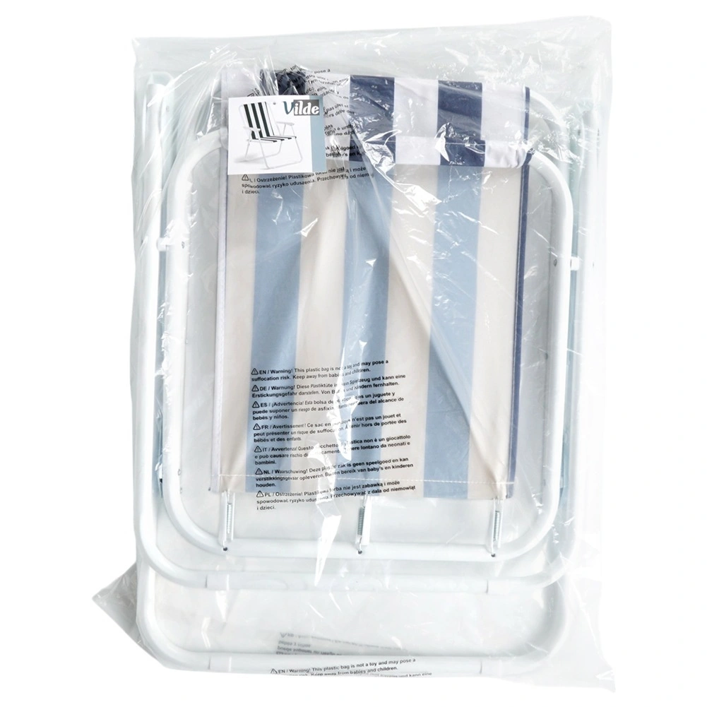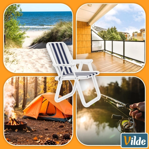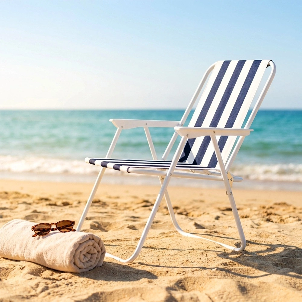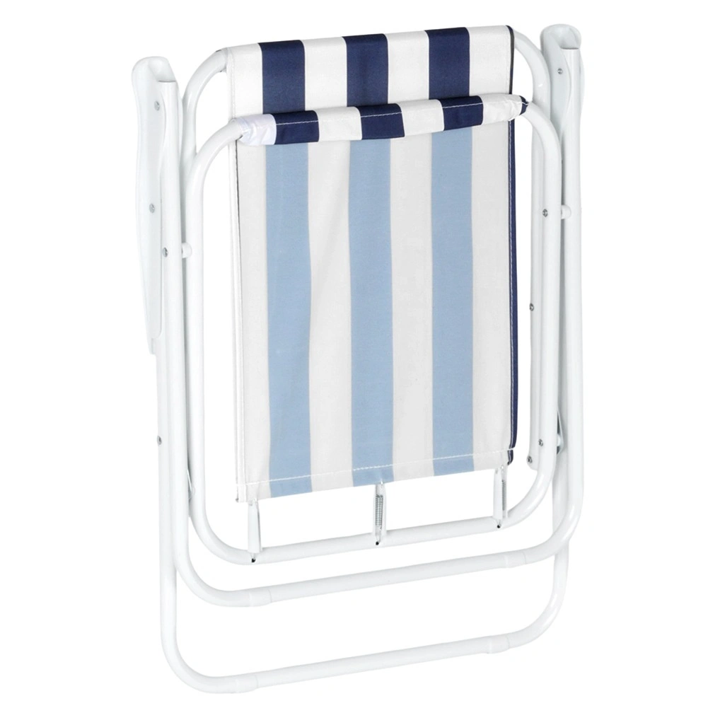 Let og bærbar sammenklappelig stol med maritime striber, ideel til strand, camping og have. Den har en solid metalkonstruktion, behagelige armlæn og kompakte mål, når den er klappet sammen, så den er let at opbevare og transportere. Maks. belastning 120 kg og slidstærkt polyesterstof sikrer lang levetid og sikker siddekomfort.