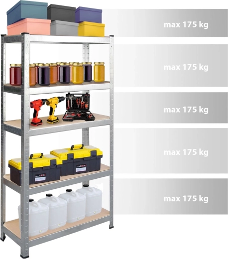 Den robuste HUMBREG-reol er ideel til garage, værksted, kælder, arkiv og butik. Takket være de galvaniserede profiler og MDF-hylder med midterafstivning giver den høj stabilitet og lang levetid. Justerbar hyldehøjde (for hver 40 mm) gør det muligt at tilpasse indretningen præcist til dine behov, mens plastfødder beskytter gulvet mod ridser.