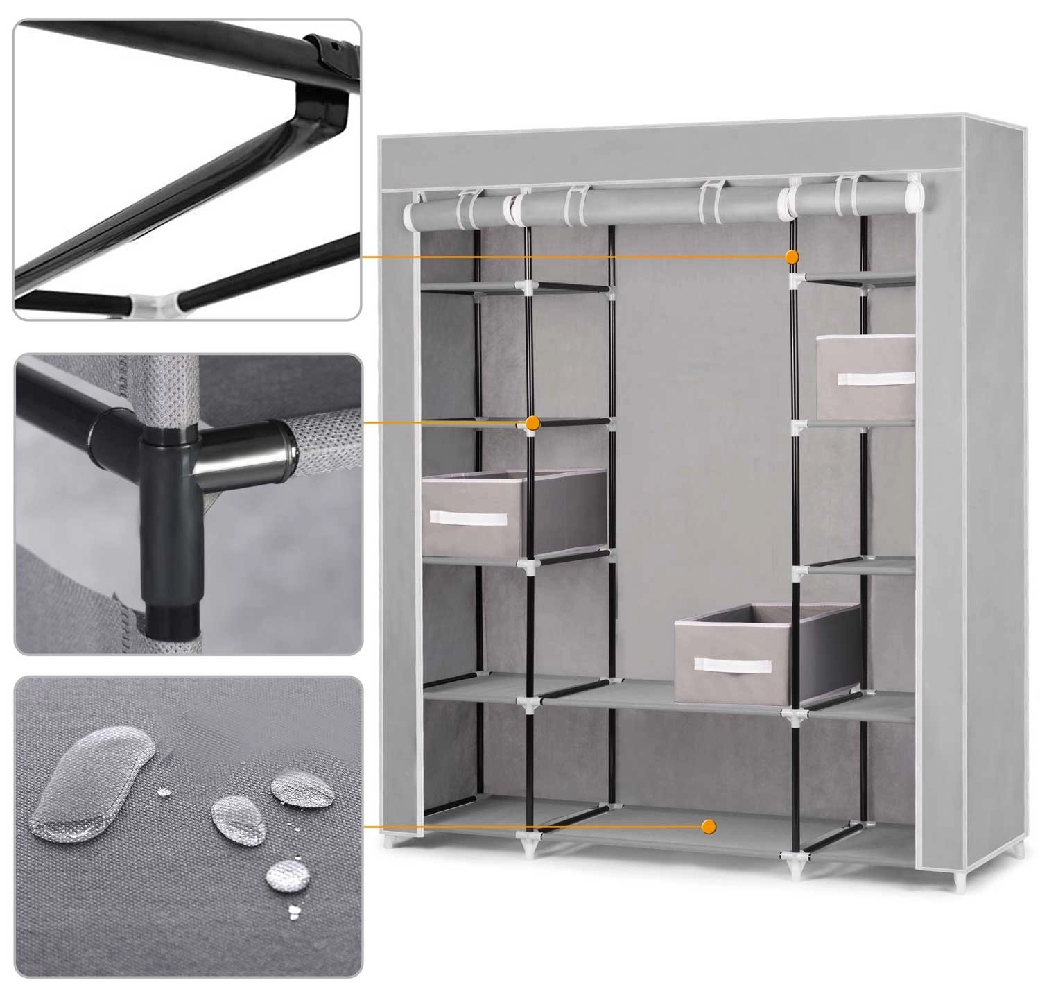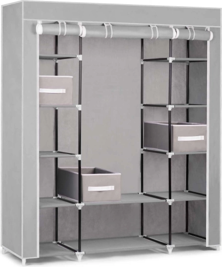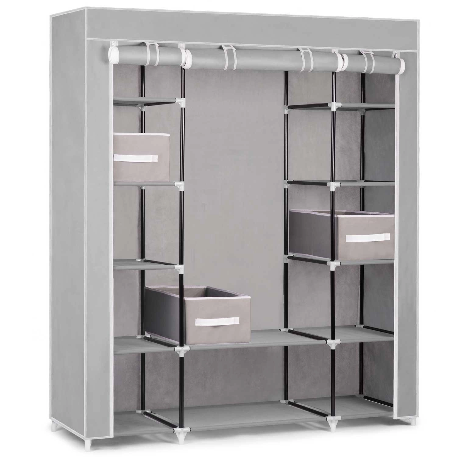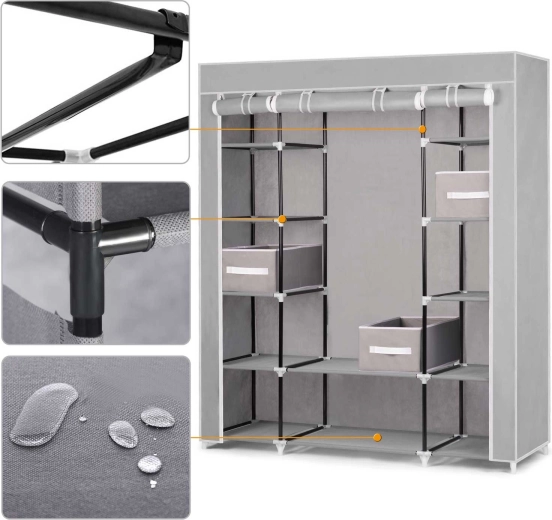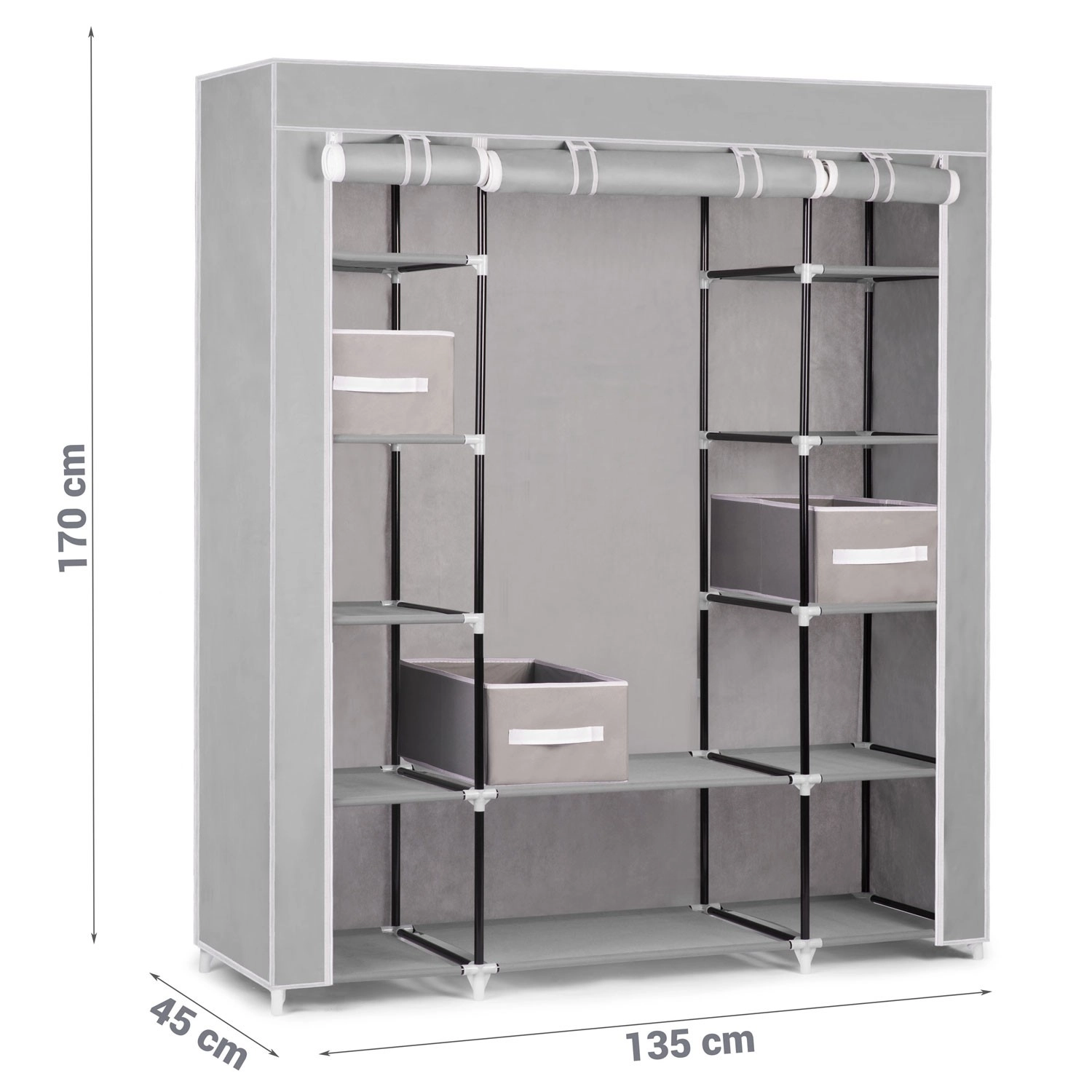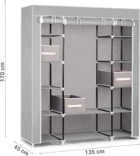 Leder du efter en fleksibel opbevaringsløsning til soveværelse, garderobe eller entré? Tekstilskabet Massido – grå er designet til maksimal overskuelighed og holdbarhed. Stålkonstruktionen med PP-samlestykker giver stabilitet, mens overfladen af vandafvisende tekstil beskytter dine ting mod støv og fugt.