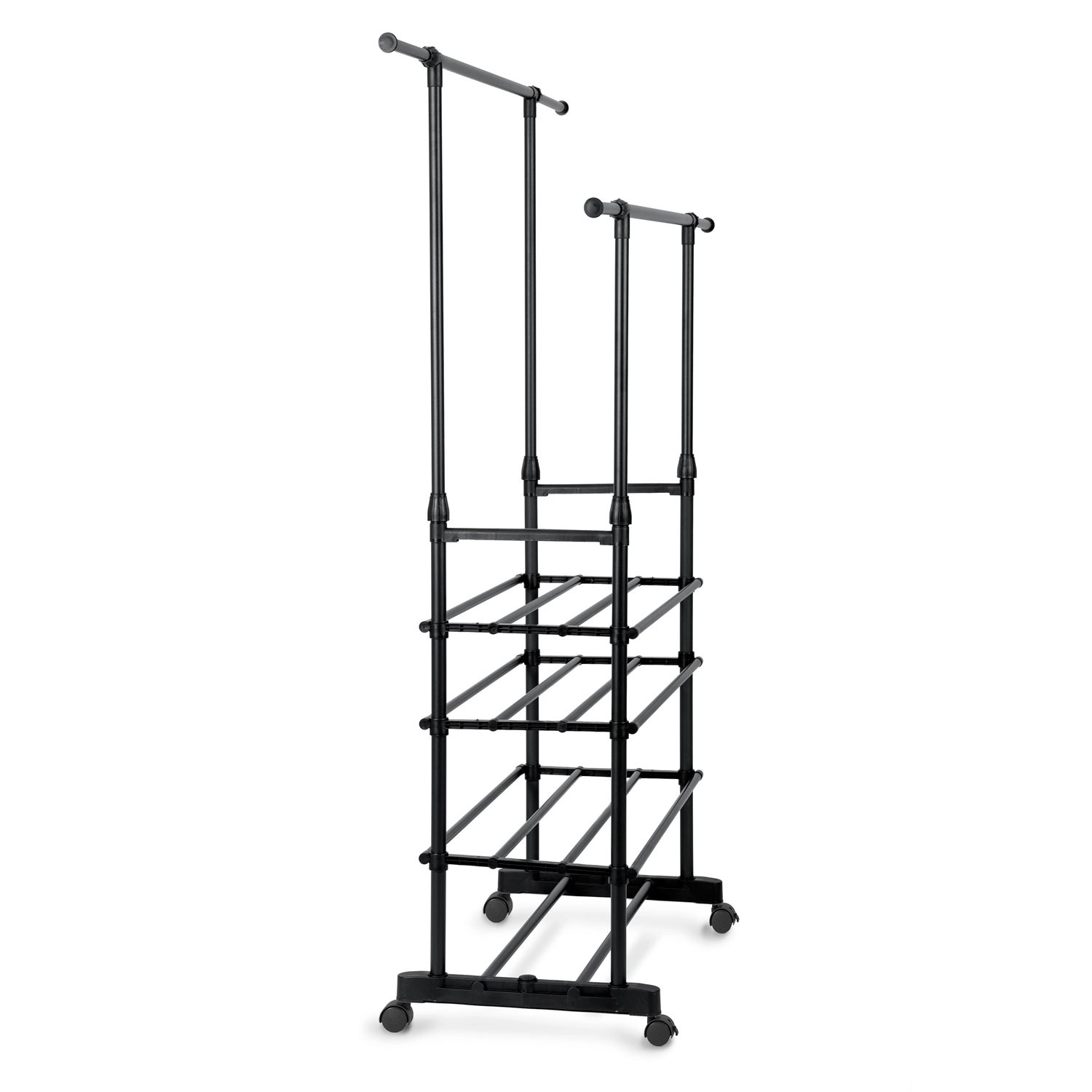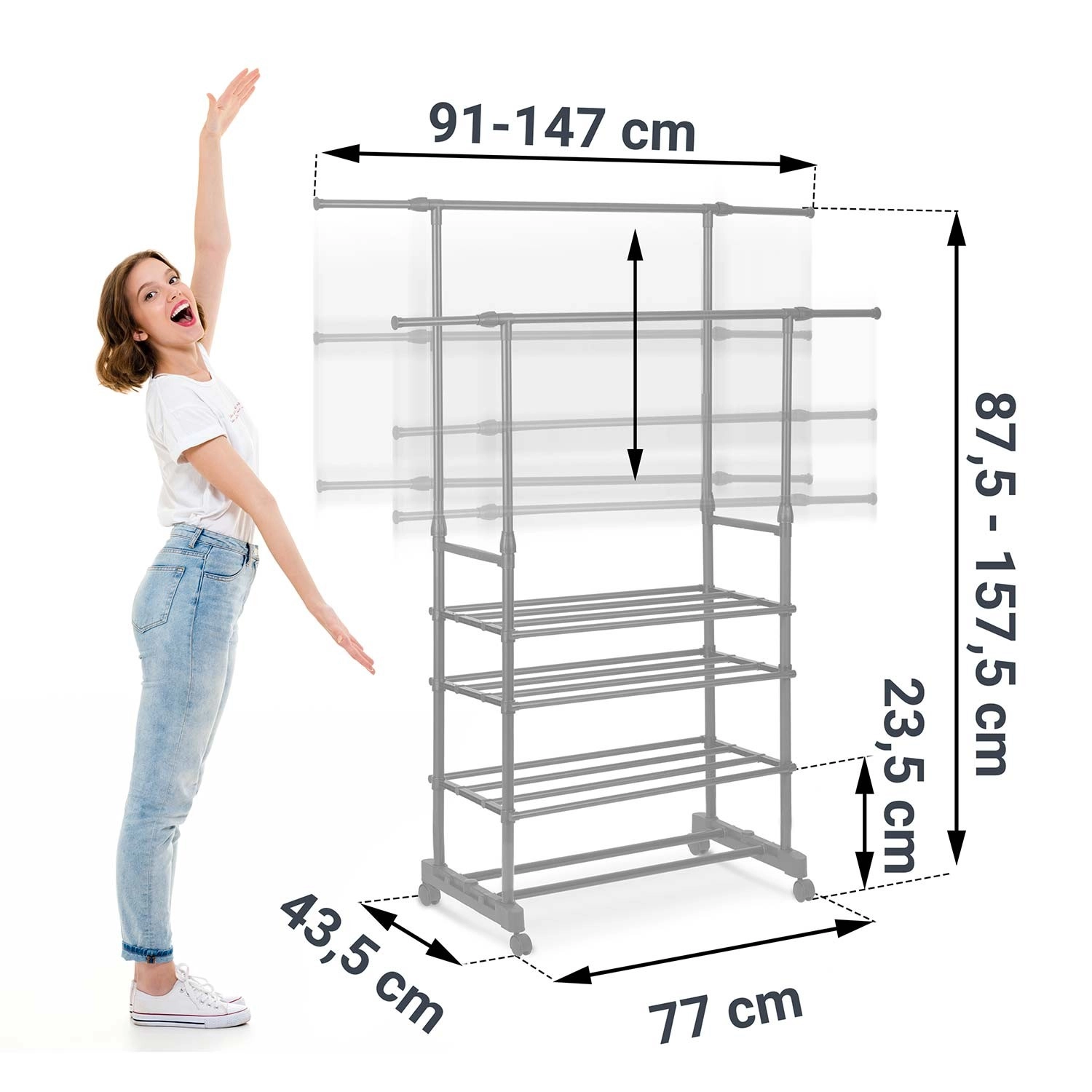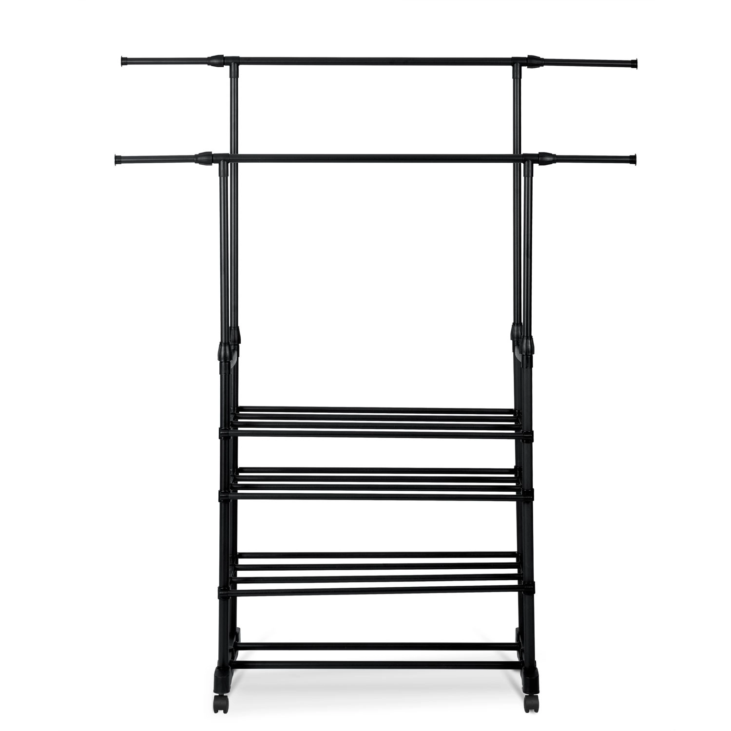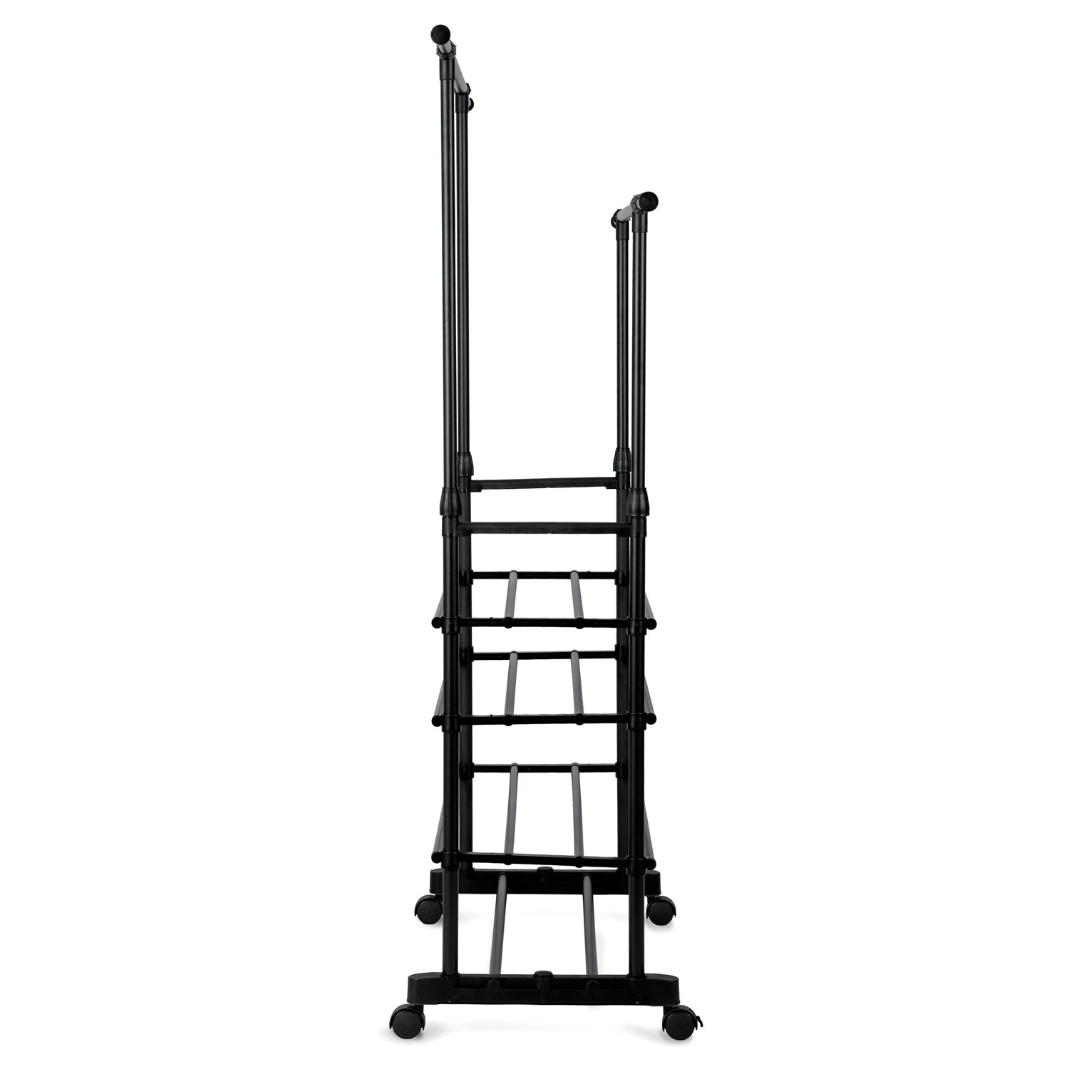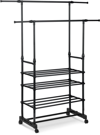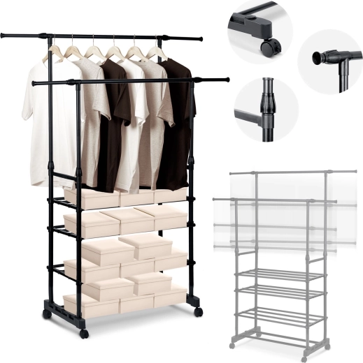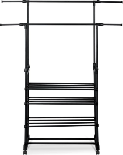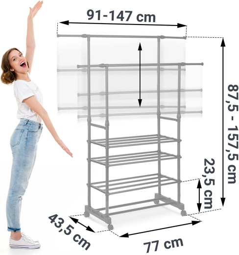 To øverste skinnestænger rummer flere beklædningsgenstande, og takket være teleskopiske stolper justerer du nemt højden til både skjorter og lange frakker.