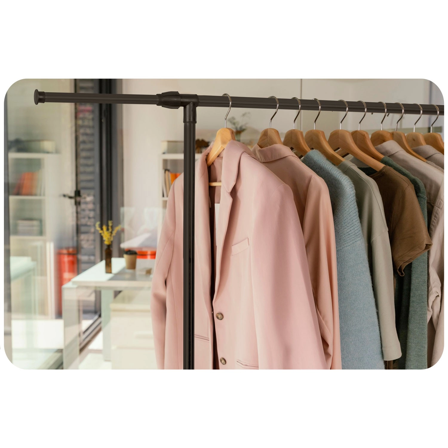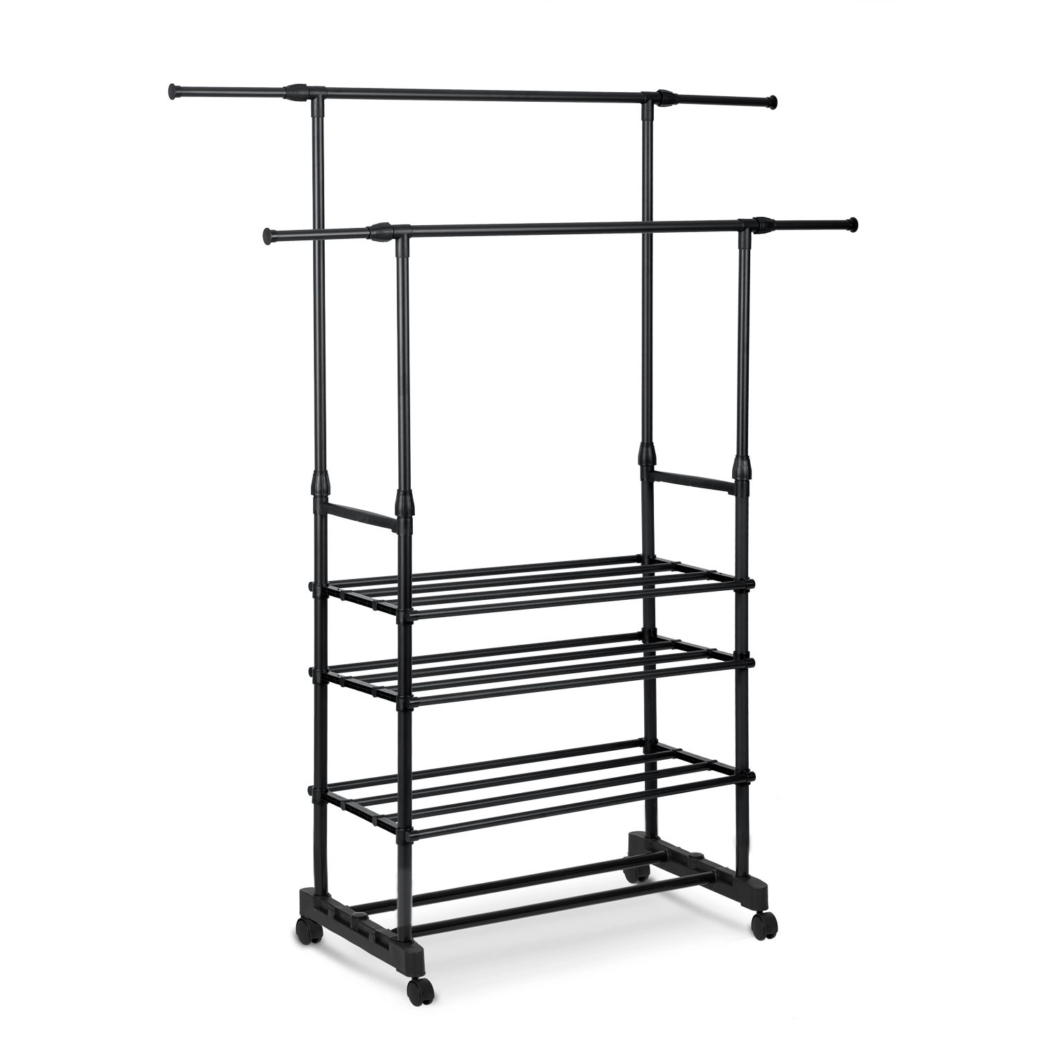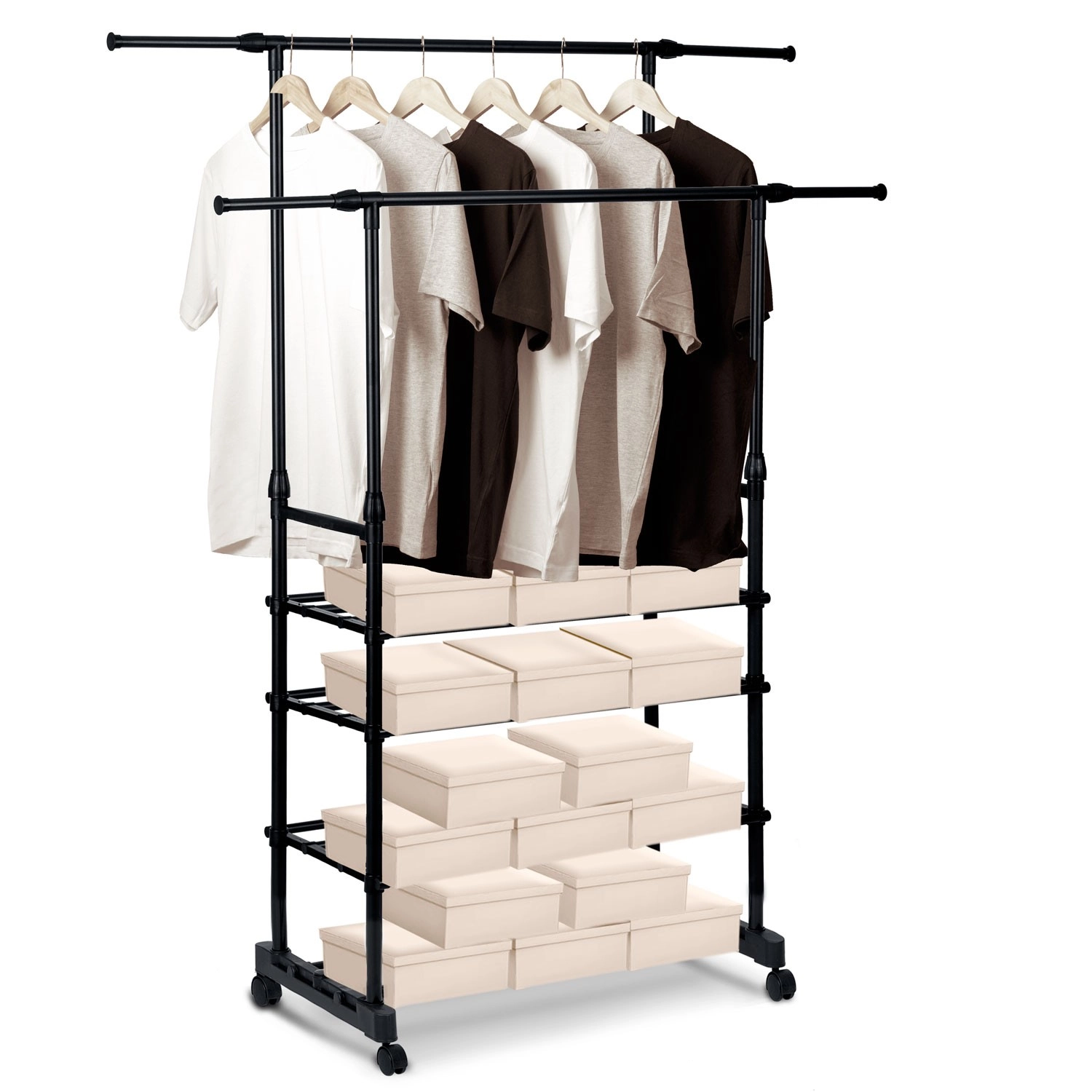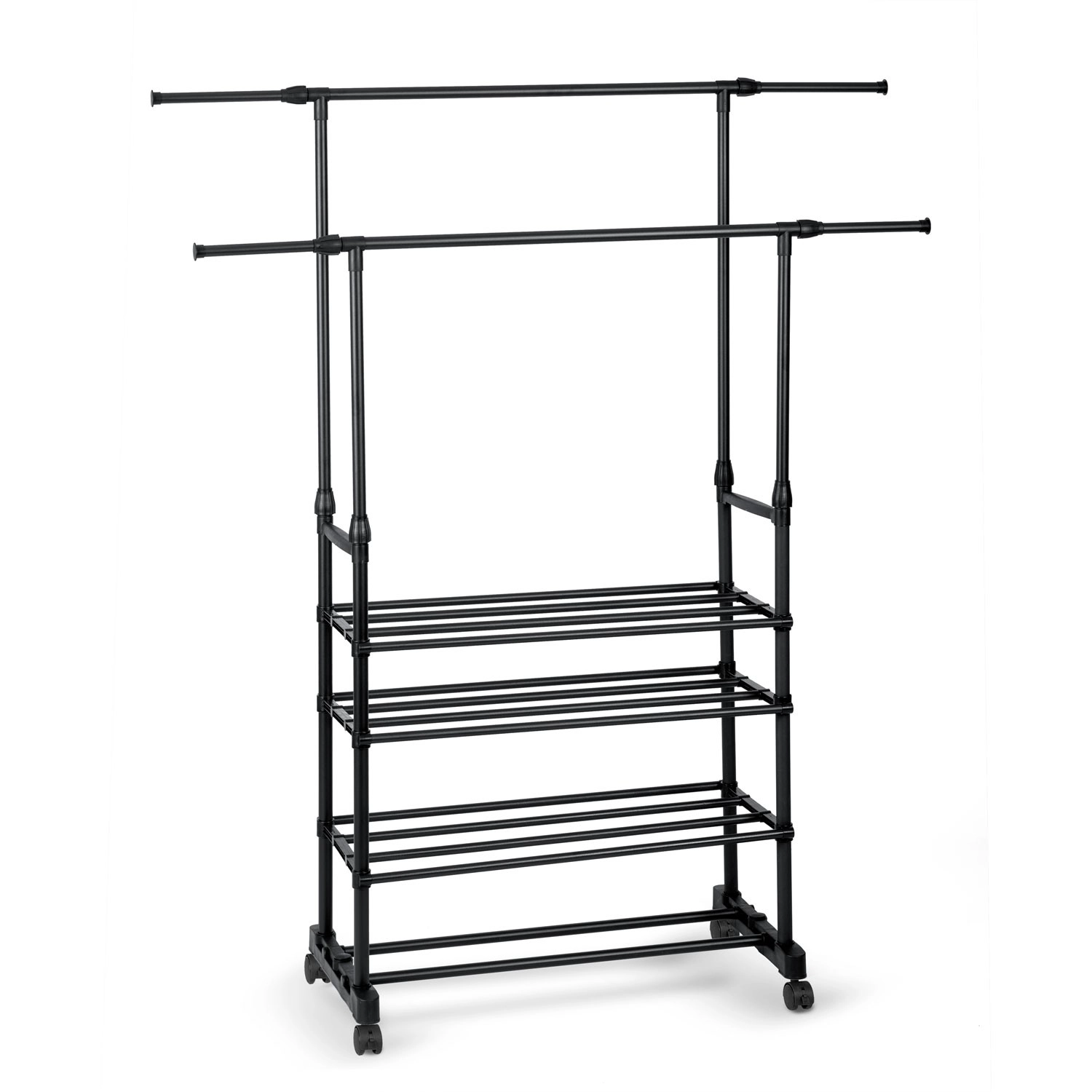 To øverste skinnestænger rummer flere beklædningsgenstande, og takket være teleskopiske stolper justerer du nemt højden til både skjorter og lange frakker.