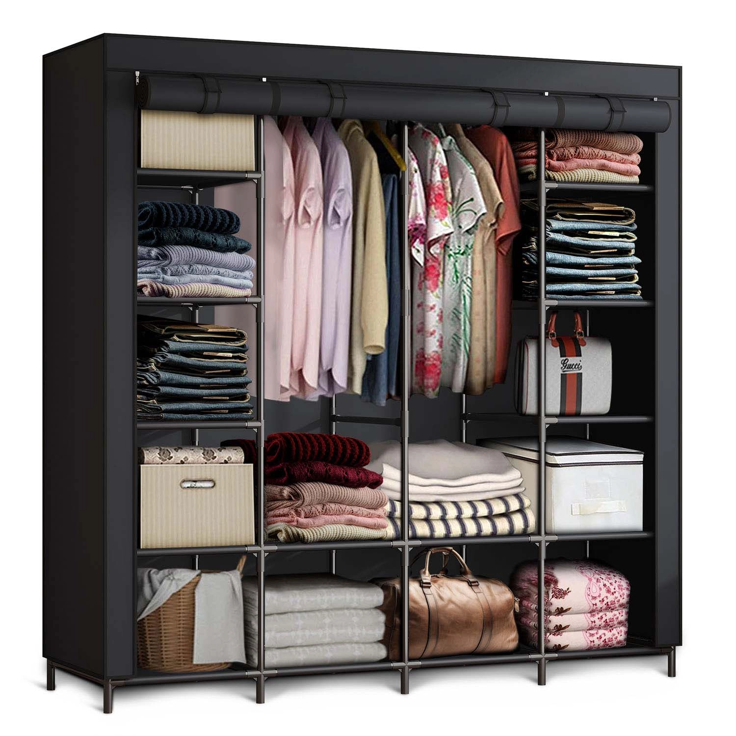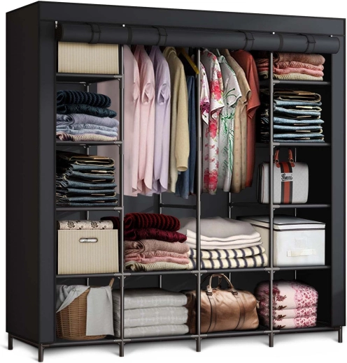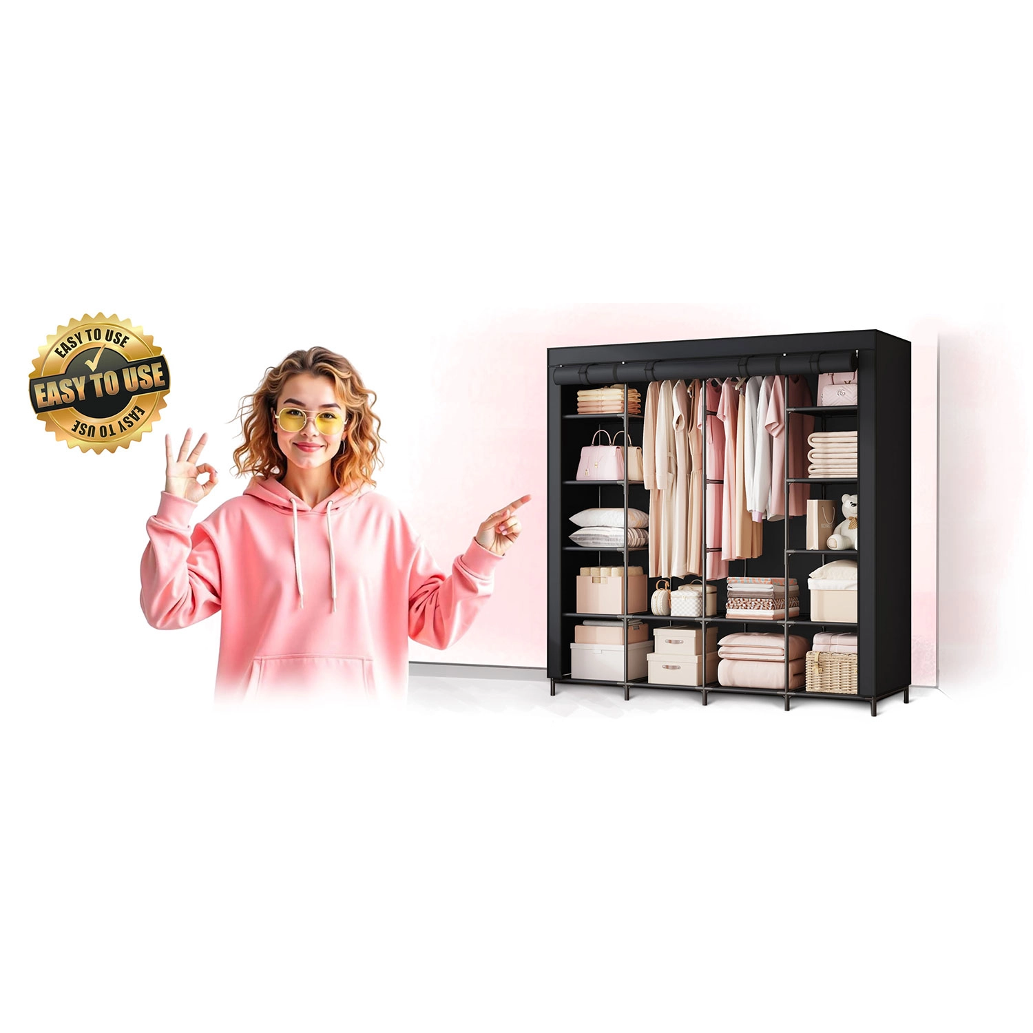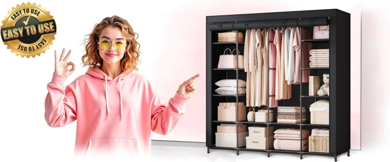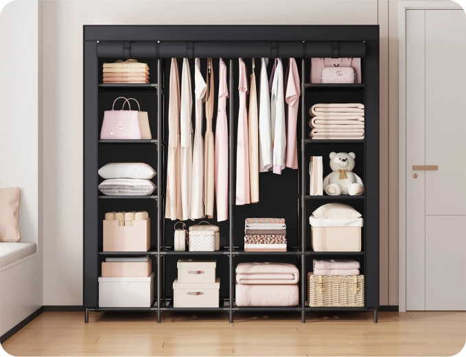 De inddelte hylder rummer sammenlagt tøj, kasser og tilbehør, mens garderobestangen holder skjorter og kjoler uden at krølle.