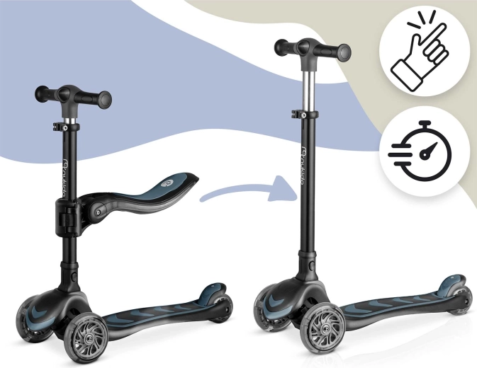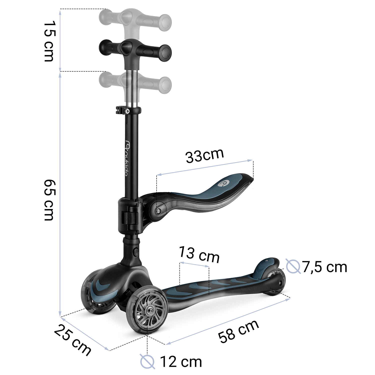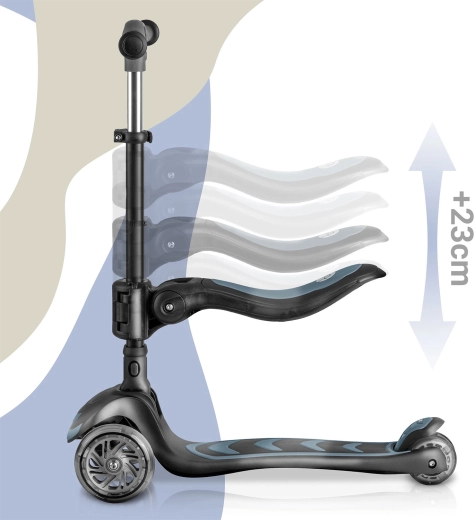 Trestrins højdejustering af styret samt et justerbart, aftageligt sæde gør det nemt at tilpasse løbehjulet til barnets aktuelle højde og færdigheder.