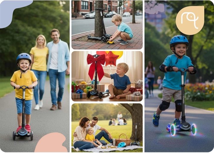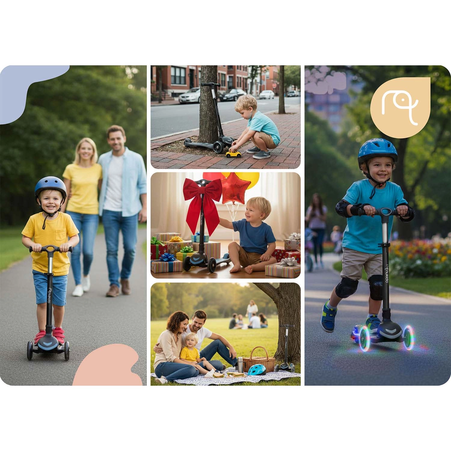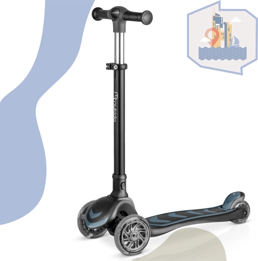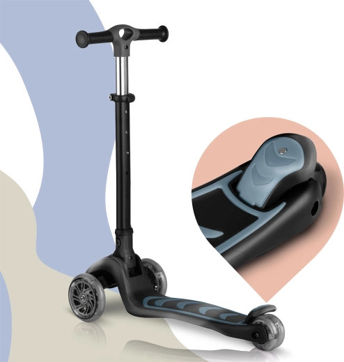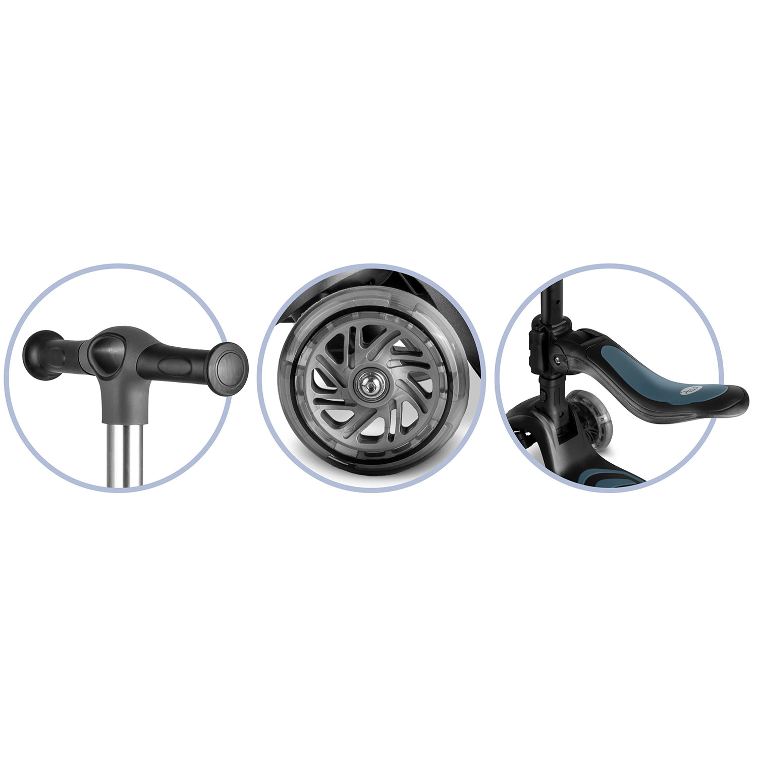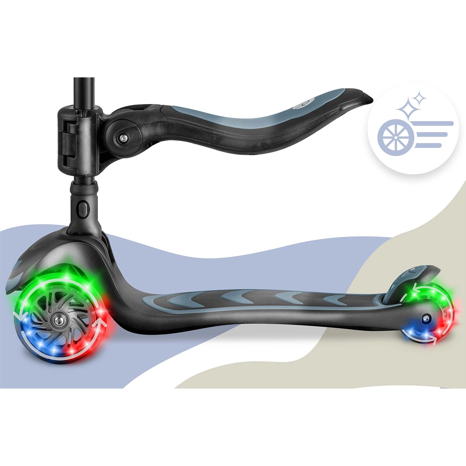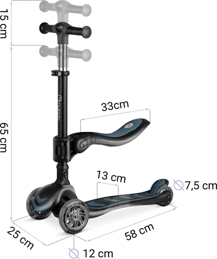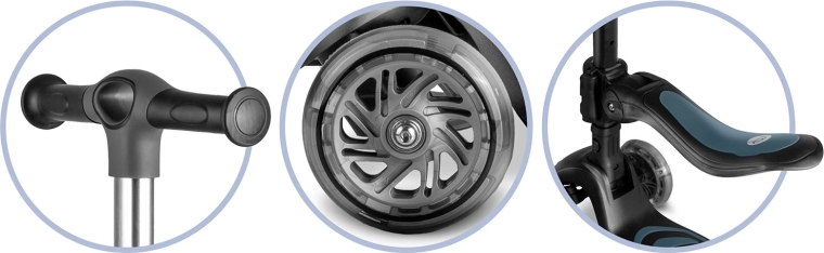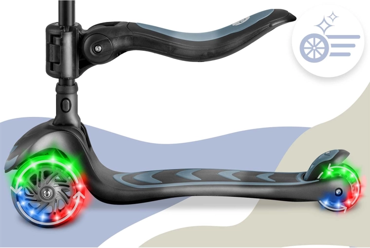 Praktiske detaljer som LED-belysning i hjulene (dynamo uden batterier), bred skridsikker fodplade og kraftig fodbremse giver komfort og sikkerhed. Højdejusterbart styr og sæde vokser med barnet, det lette aluminiumstyr gør det nemt at manøvrere, og den holdbare konstruktion sikrer langvarig brug.