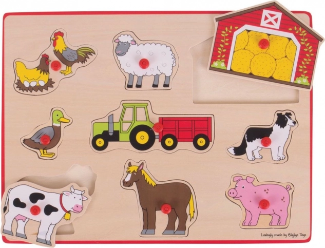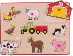 Indsættende puslespil Bondegård fra Bigjigs Toys tilbyder sjove og lærende øjeblikke for børn. Match hver farverige brik med den korrekte formede åbning på basispladen. Dette træpuslespil hjælper med at udvikle ordforråd og associering af former, farver og billeder.