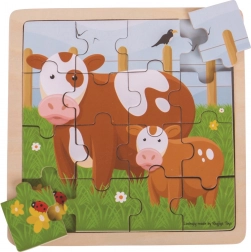 Den omsorgsfulde ko med sin kalv inviterer børn ud på den grønne eng – der venter en hyggelig pusleoplevelse, som støtter finmotorik og tålmodighed. Brikkerne er robuste, glat forarbejdede og tilpasset små hænder, så de er lette at håndtere. Takket være formatet 18 × 18 × 1 cm passer puslespillet både hjemme og på farten.