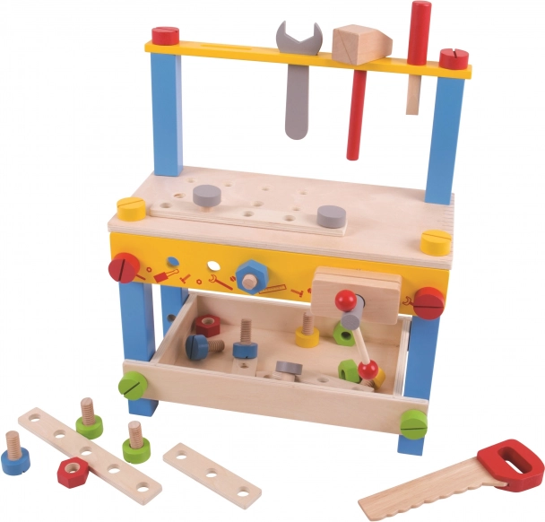 Sættet omfatter skruestik, nøgle, skruetrækker, hammer, sav, skruer og møtrikker, som kan samles og skilles ad igen og igen. Den stabile konstruktion og smarte opbevaringsløsninger holder alting overskueligt og lige ved hånden. Sættet er ideelt til både selvstændig og fælles leg og fremmer tålmodighed og koncentration.