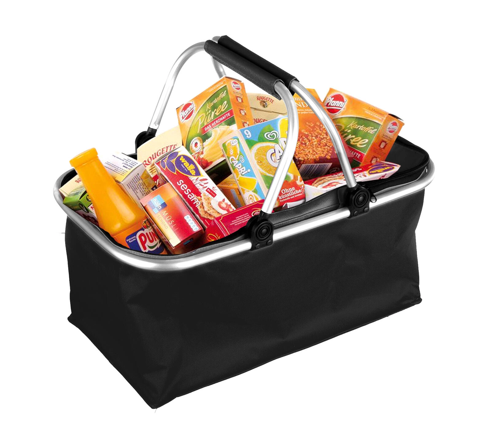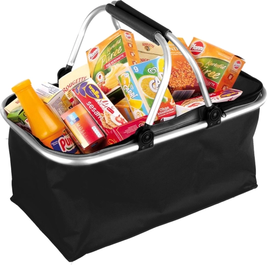 Praktisk sammenklappelig campingkurv i elegant sort er ideel til picnic, grill og weekend på sommerhus. Den tilbyder rummelig kapacitet, let og holdbar aluminiumsramme, afvaskeligt polyesterbetræk og lynlåslukning for sikker transport af mad og udstyr.