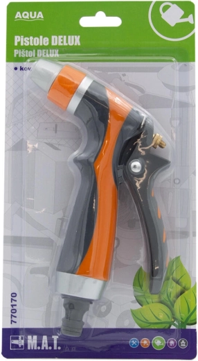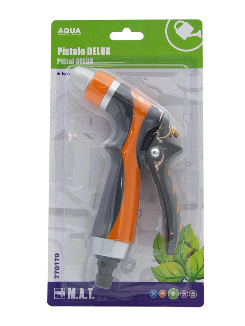 Den universelle metalpistol DELUX AQUA er et robust tilbehør til haveslangen til nem vanding og afskylning. Takket være det fuldmetallic chassis tilbyder den lang levetid, pålidelighed og behagelig betjening ved dagligt havearbejde.