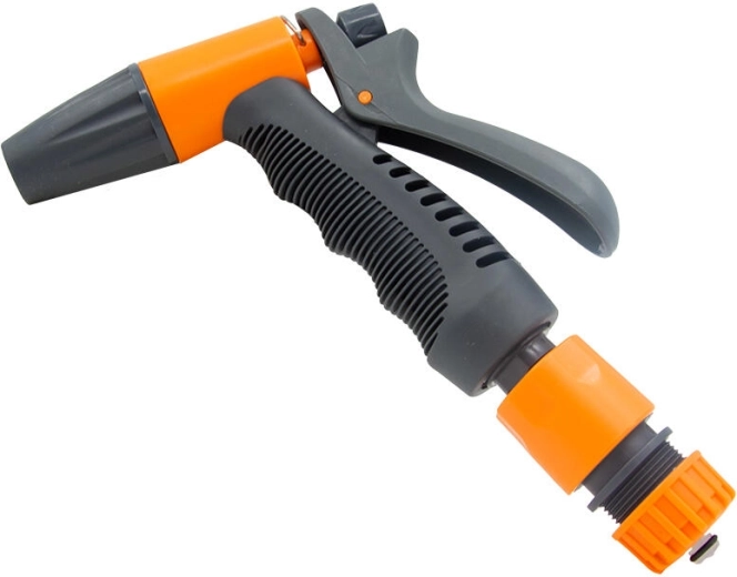Praktisk havesæt til vandslanger indeholder en justerbar sprøjtepistol og en STOP-hurtigkobling 1/2" til øjeblikkelig afbrydelse af vandgennemstrømningen ved frakobling. Ideel til behagelig vanding, afskylning og havevedligeholdelse med nem betjening og pålidelig plastkonstruktion.