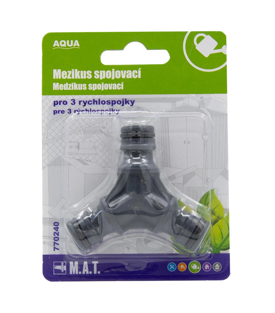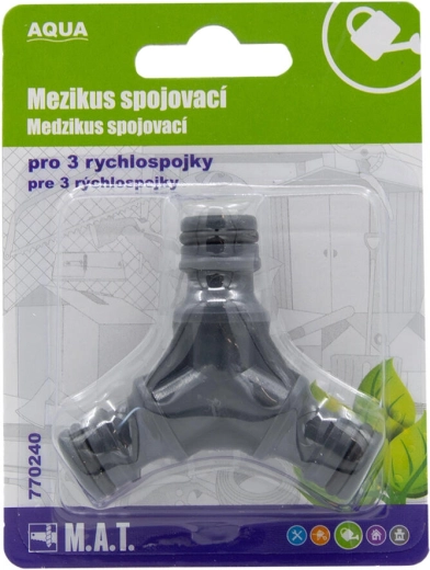 Gør havearbejdet lettere med det universelle mellemstykke til tre lynkoblinger 1/2" fra AQUA. Dette praktiske element gør det muligt hurtigt at forbinde slanger og tilbehør uden kompliceret montering. Takket være den lette og robuste plastkonstruktion er det ideelt til daglig brug ved vanding, vask eller irrigering.