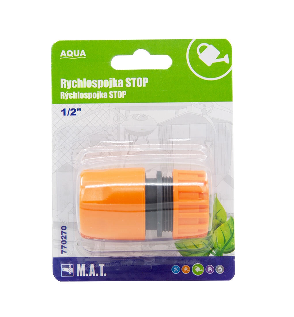 Hurtigkobling med stopventil 1/2" AQUA til nem og hurtig tilslutning af haveslange. Stopventilen lukker automatisk for gennemstrømningen ved frakobling af tilbehør, så der er ingen unødvendig sprøjt. Robust udførelse og pålidelig tætning for problemfri vanding.